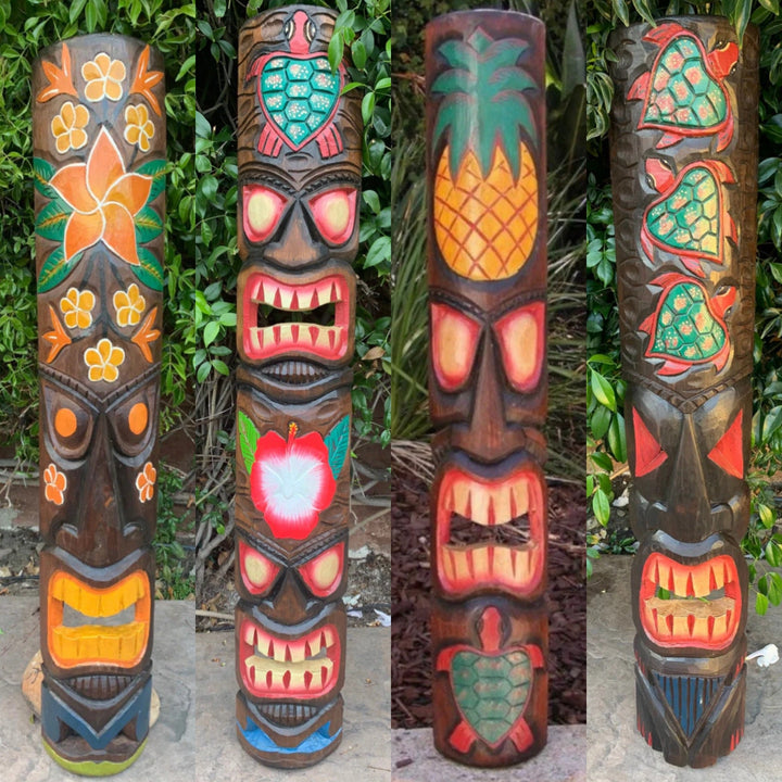 Add some tropical flavor to your home decor with this set of 4 hand-carved wooden Tiki totem masks. These masks are perfect for any room, entryway, lanai, or patio and will give your space a unique and stylish look. The masks are 39" in height and 6" in width, making them a great size to fit any wall space. Crafted by The Tiki Stop, these masks are made of high-quality wood and feature a beautiful tropical theme that will add a touch of fun to your home. Whether you're looking to decorate your indoor or outdoor space, these masks are sure to impress. Mount them on the wall for a easy and hassle-free display. Get your hands on this set of Tiki totem masks today and give your home a stylish and tropical vibe!