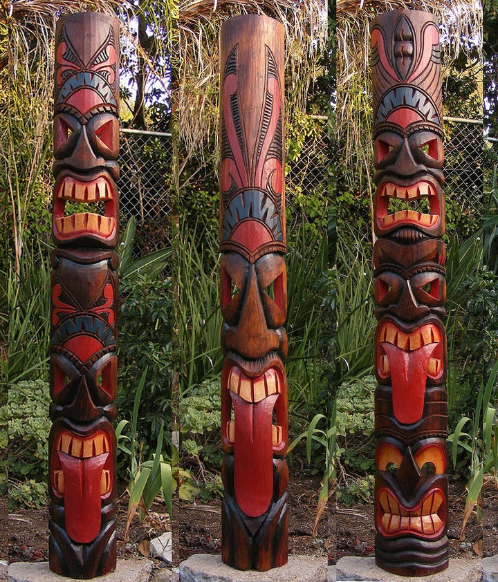 3 Set of 5 ft Hand Carved Wooden Tiki Totem Masks Tropical Bar Patio Decor 60"x 7"in