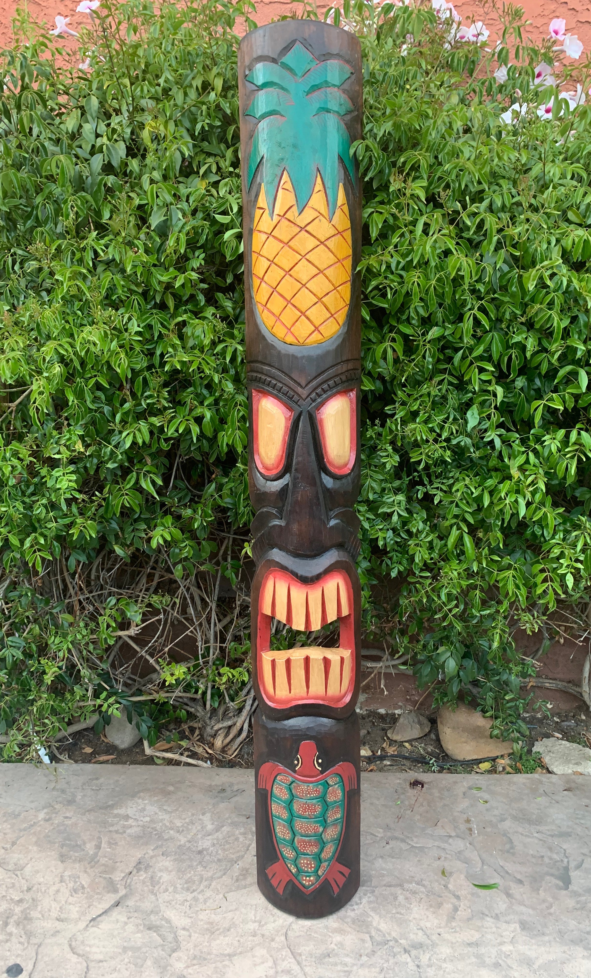 This hand-carved wooden Pineapple and Turtle tiki mask would make a great addition to your home, patio, yard, or tiki bar! These masks are beautifully hand crafted and painted making each one unique. The backs of the masks are hallowed out to fit around poles, or can be hung flat up on the wall. This mask will make a great gift, or buy it for yourself! :) 60"x 7" inches