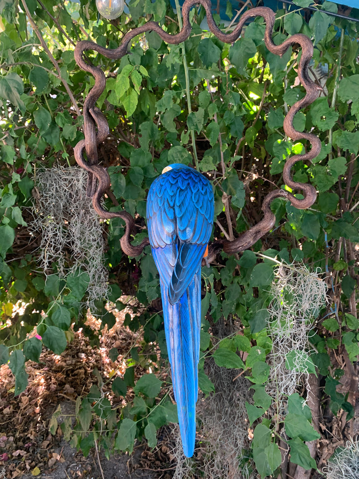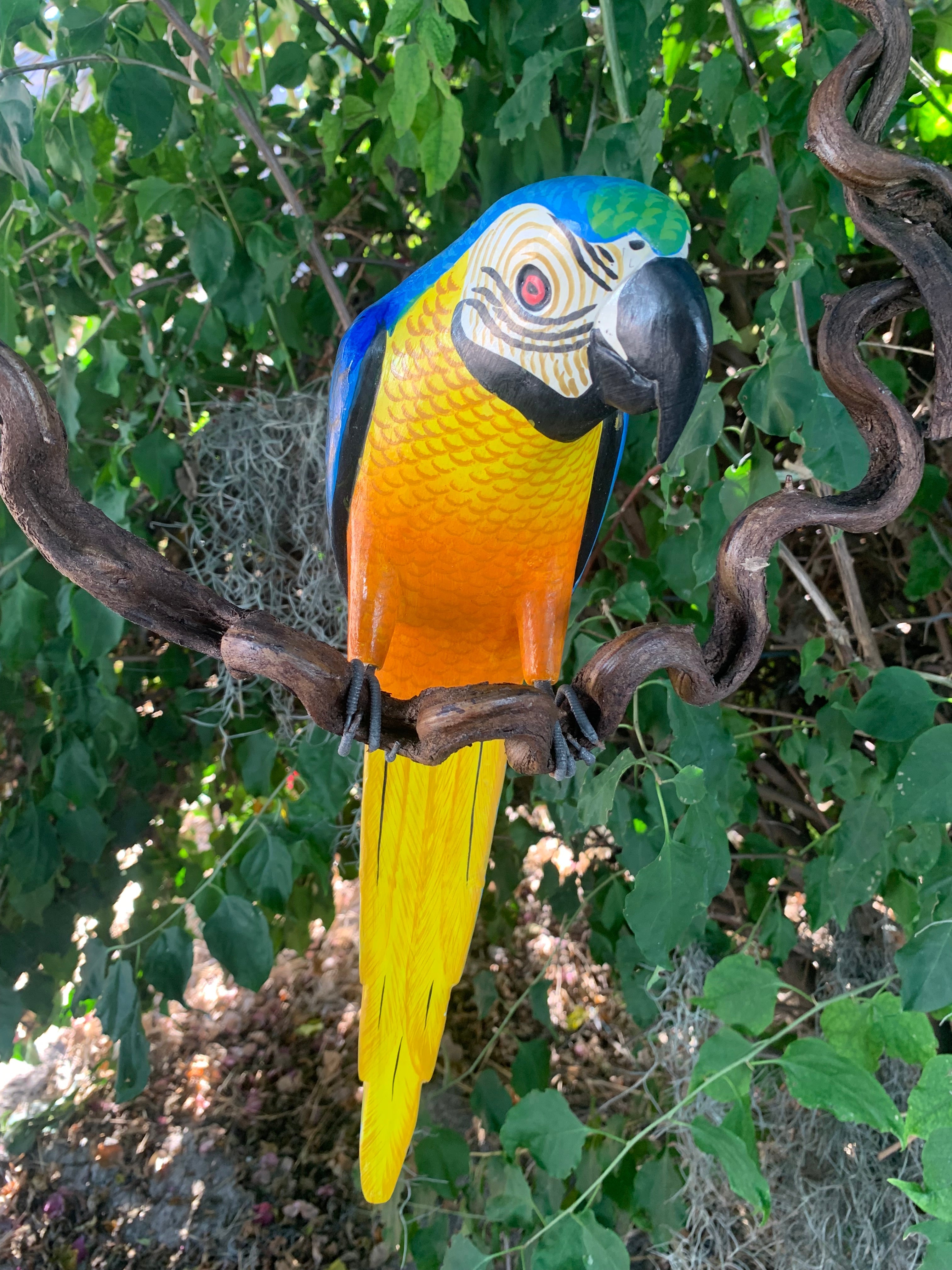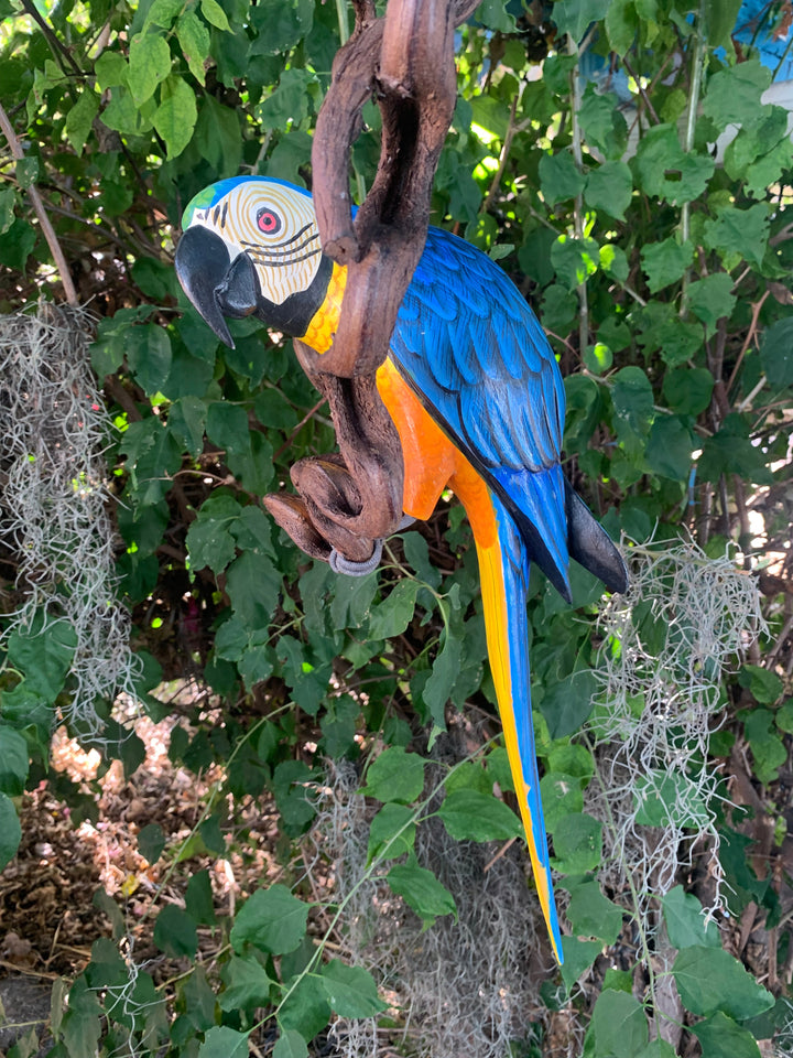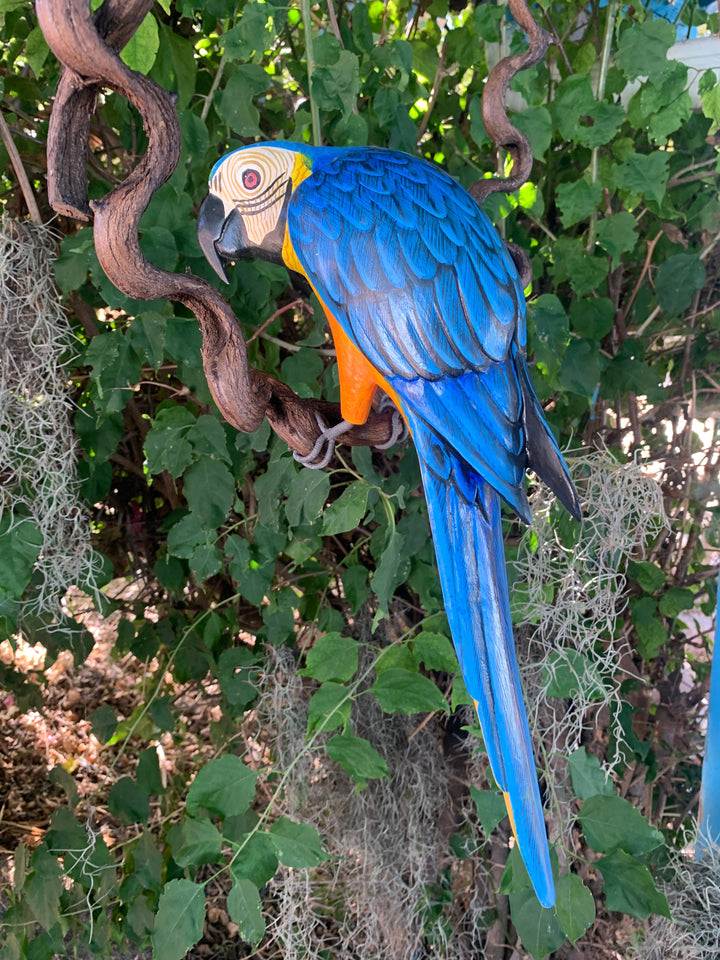Beautiful Wood-carved Blue and Yellow Macaw Parrot. Each one is hand carved and painted, creating a one of a kind piece of art. The tropical bird sits upon a unique wooden perch that frames the carving like a vine. This would make a beautiful addition to your home, patio, garden, yard, or Tiki bar!!! The bird itself is 17” from head to tail. Would make a great gift, or bring it home to your jungle!
