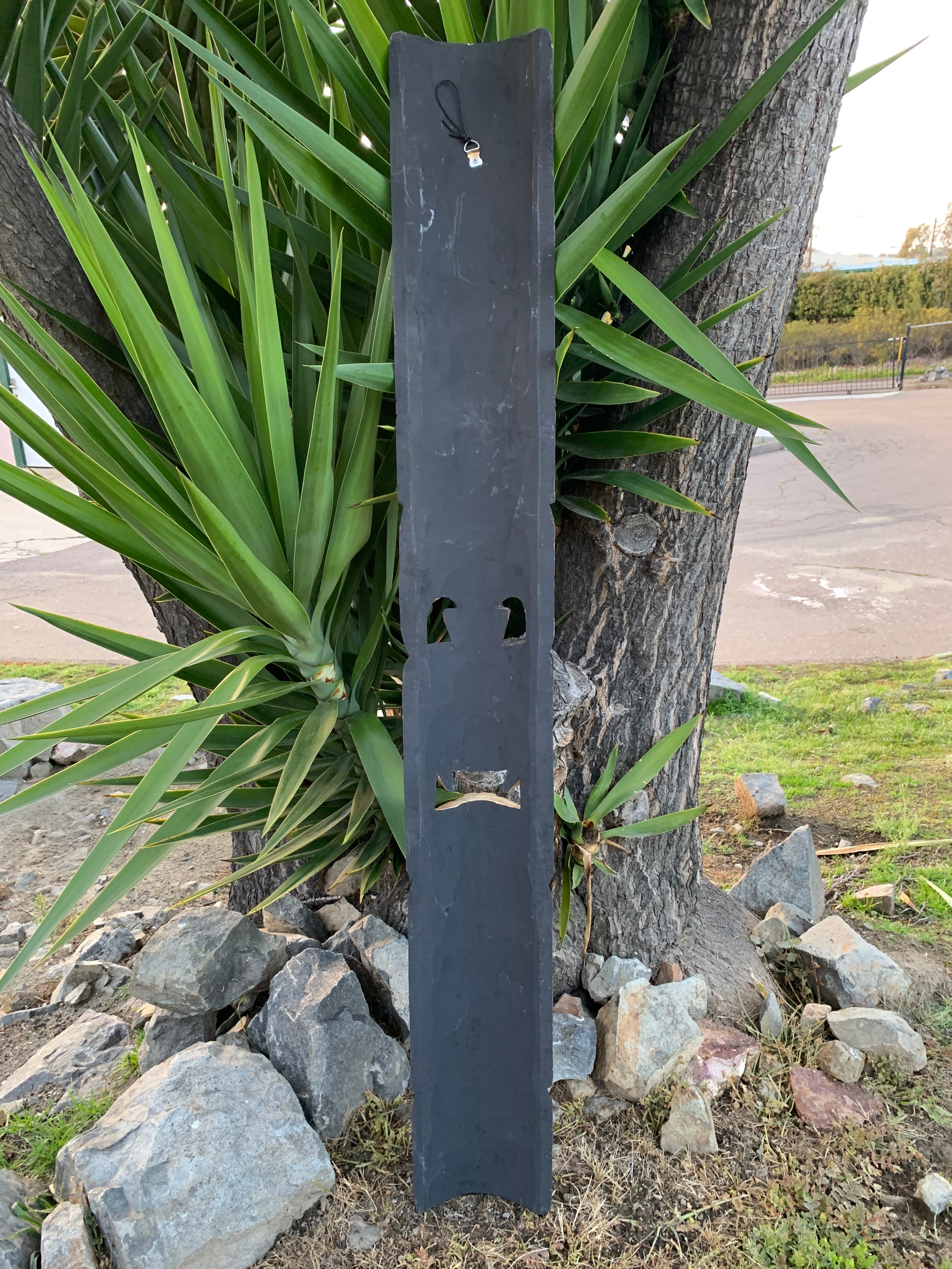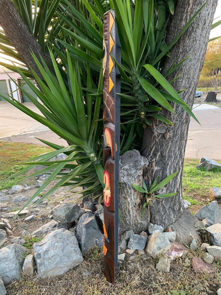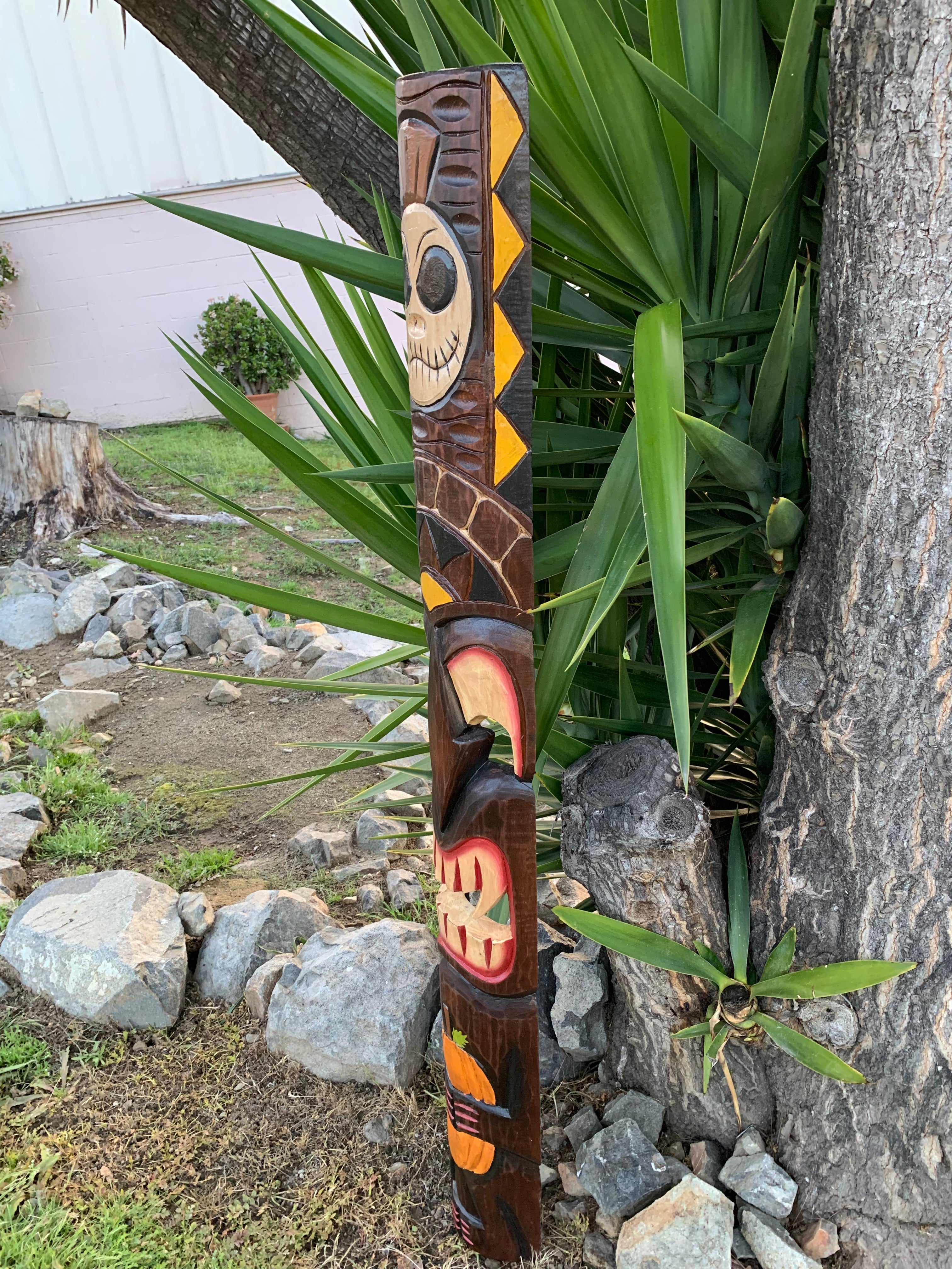 Get ready for Halloween with this unique Tiki Stop wood mask! This awesome Halloween Tiki with Vampire Fangs is one of my own creations. Who doesn't love Halloween and Tiki?? This hand-carved wooden tiki mask would make a great addition to your home, patio, yard, or tiki bar! These masks are beautifully hand crafted and painted with a Jack skeleton on top, and it is holding a pumpkin, The backs of the masks are hallowed out to fit around poles, or can be hung flat up on the wall. This mask will make a great gift, or buy it for yourself! :) 5 ft"x 6-7" inches. The mask is perfect adding a spooky touch to your party. Celebrate Halloween in style with this one-of-a-kind mask!