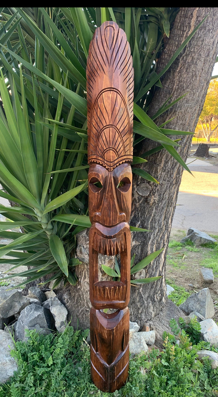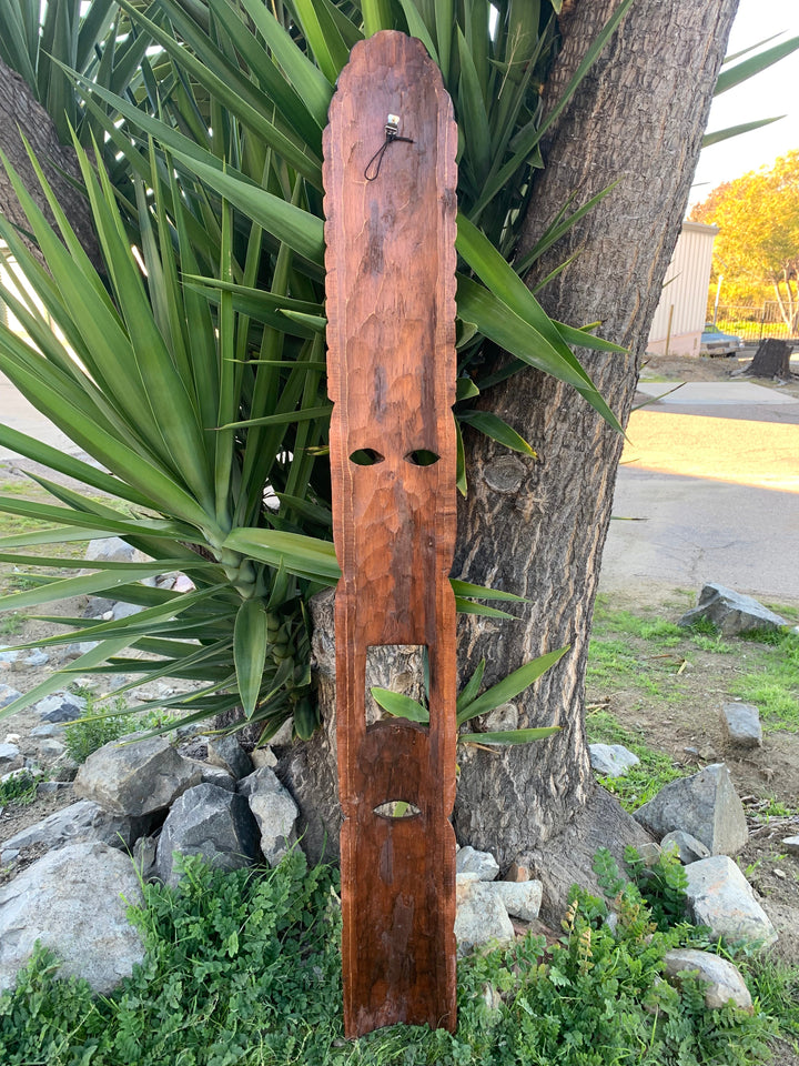 This Hawaiian style wood carved mask is a great way to spice up any patio, room, or tiki bar! These masks are beautifully hand carved and stained. They can be used indoors or outdoors. The backs of the masks are hallowed out to fit around poles but can be placed flat against the wall. This mask will make a great gift or put this piece up in your own home, patio, or yard. Approximately 5' ft x 7" in