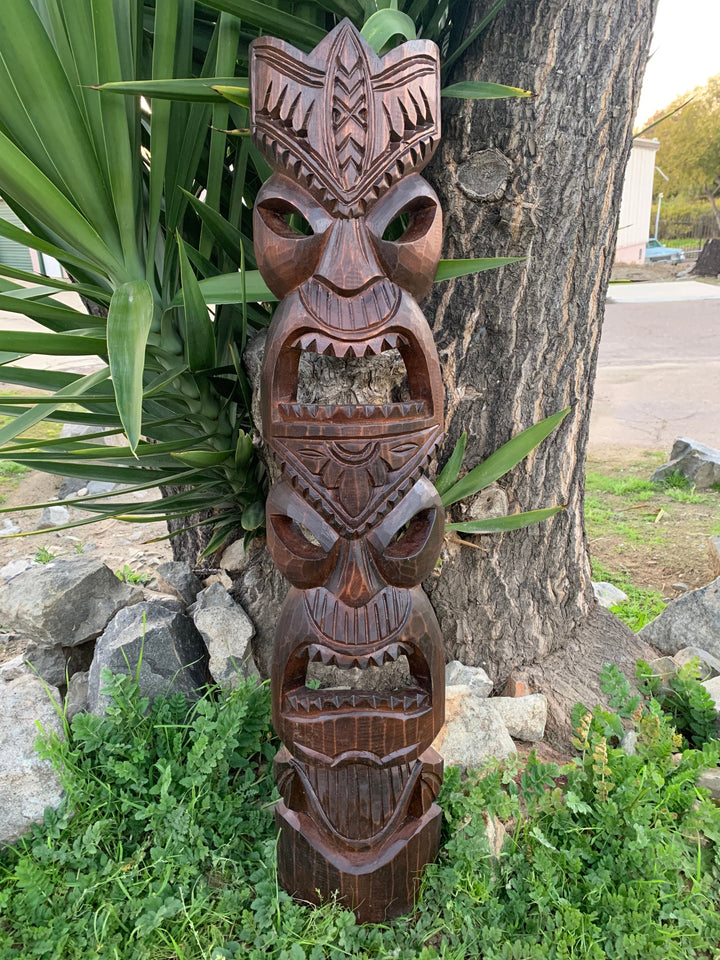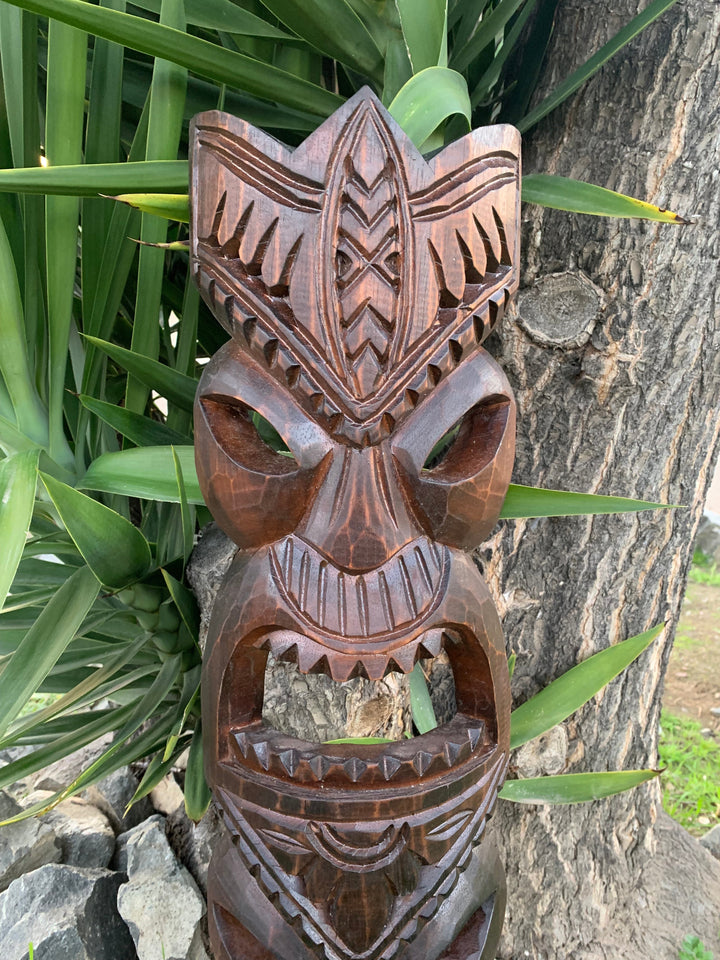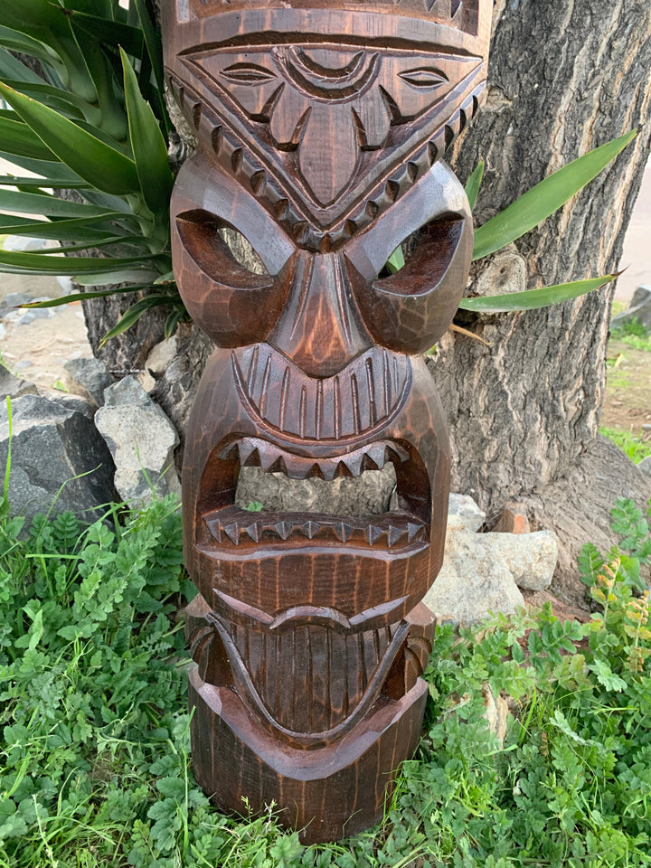 Hawaiian style wood carved tiki mask is a great way to spice up any patio, room, or tiki bar! These masks are beautifully hand carved and stained. They can be used indoors or outdoors. The backs of the masks are hallowed out to fit around poles but can be placed flat against the wall. This mask will make a great gift or put this piece up in your own home, patio, or yard. Approximately 39” x 8 inches