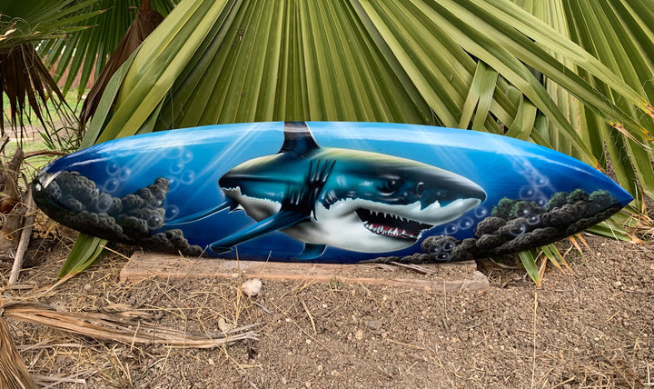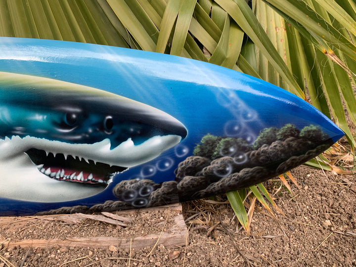Great White Shark Airbrushed Decorative Surfboard Wall Plaque Mango Wood Coastal Decor 39"x 10"