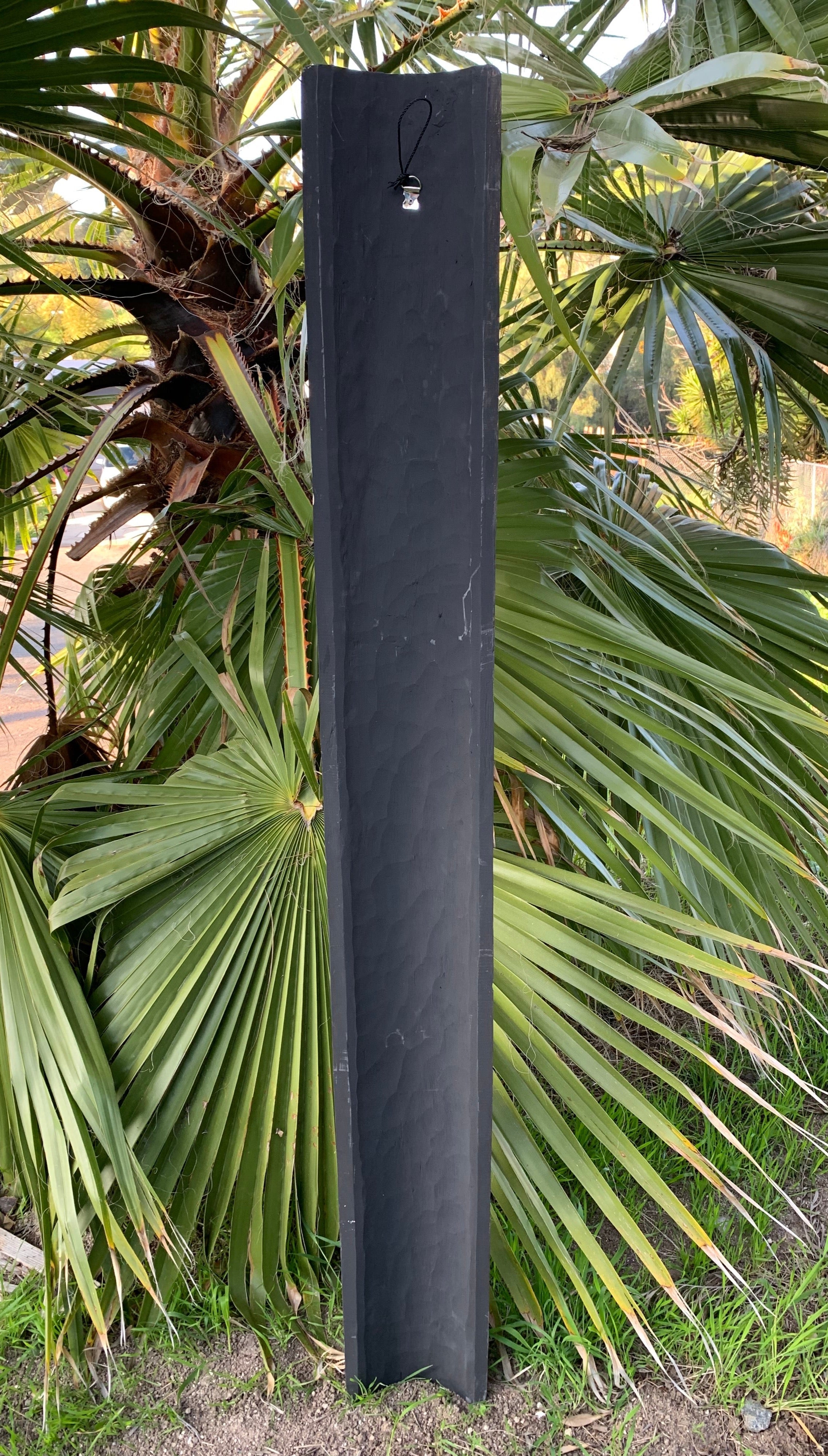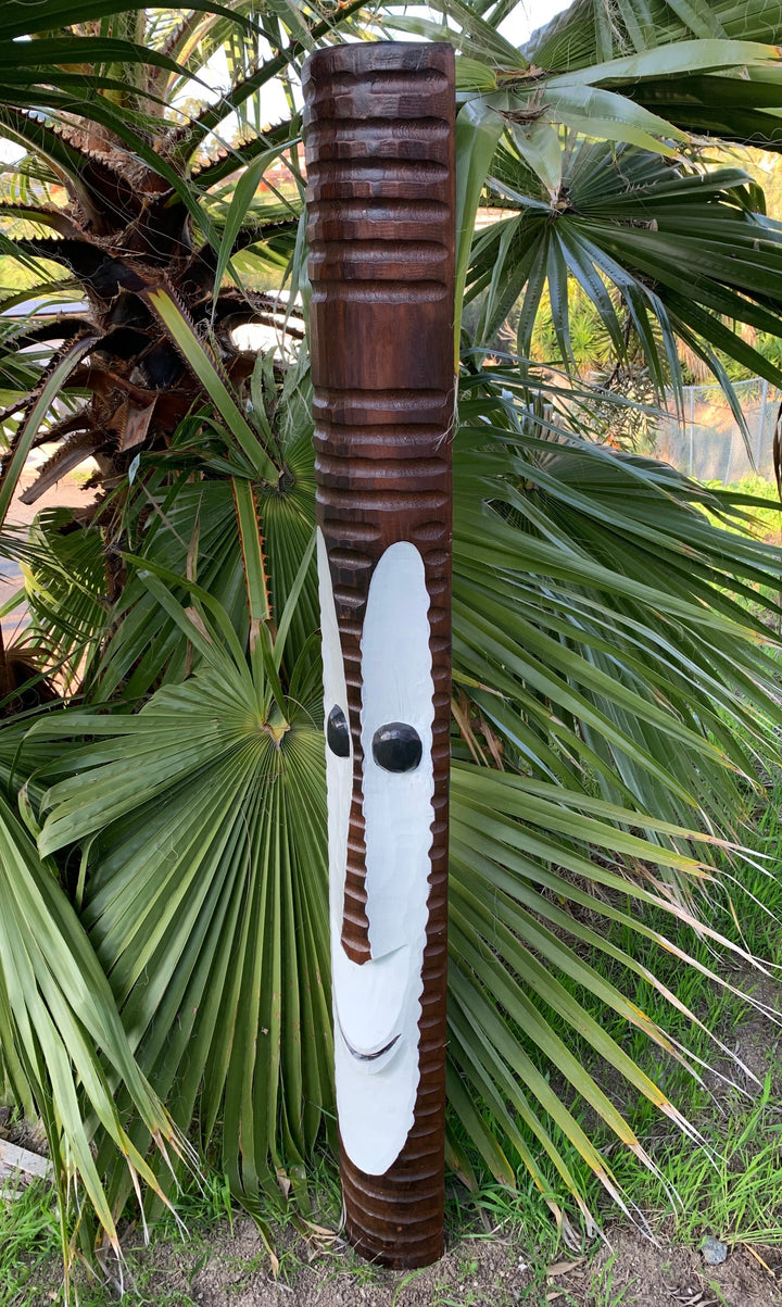 Introducing our new addition.... TIKI BOB! This hand-carved wooden tiki mask would make a great addition to your home, patio, yard, or tiki bar! These masks are beautifully hand crafted and painted making each one unique. The backs of the masks are hallowed out to fit around poles, or can be hung flat up on the wall. This mask will make a great gift, or buy it for yourself! :) 5 ft"x 7" inches