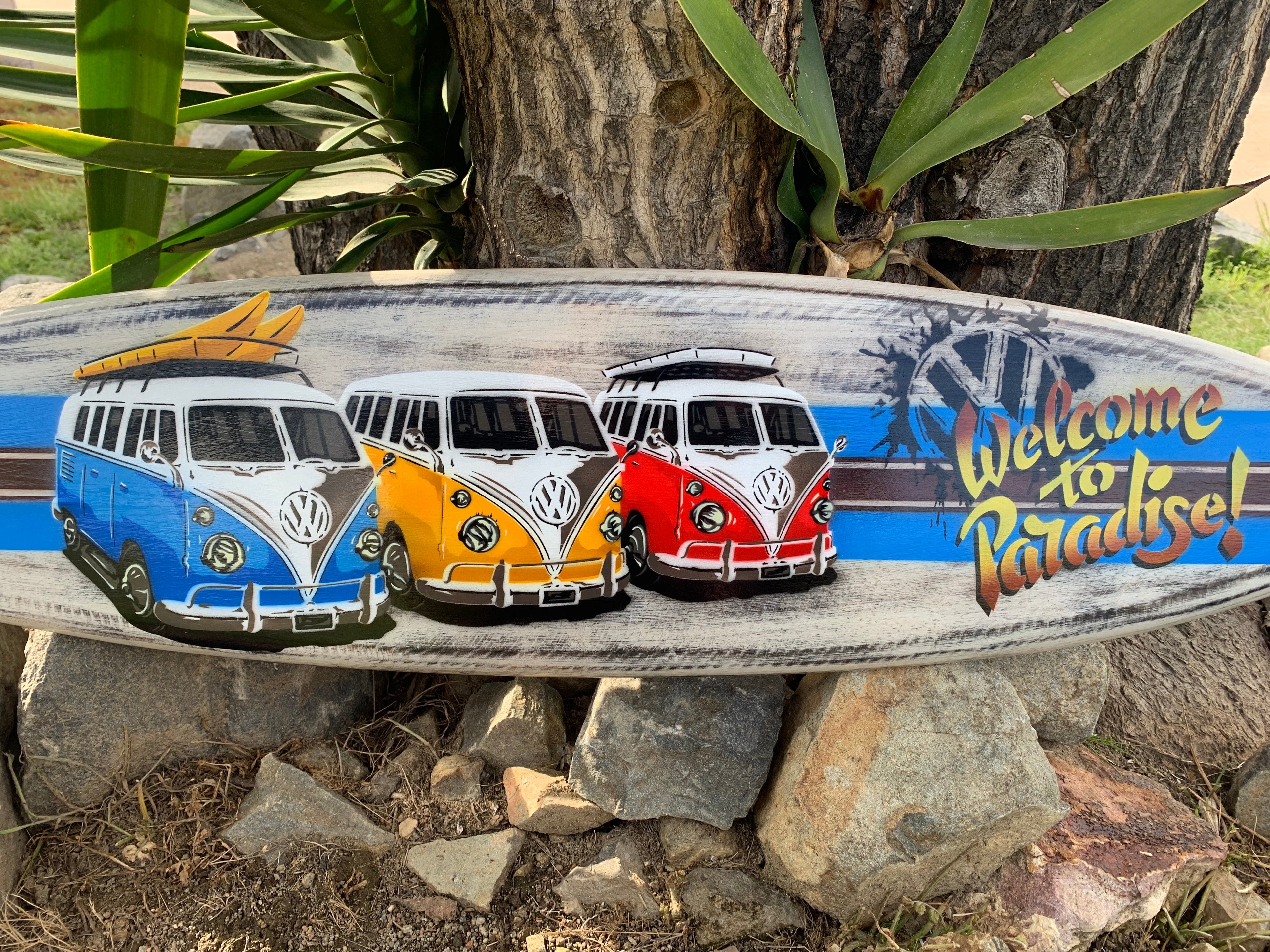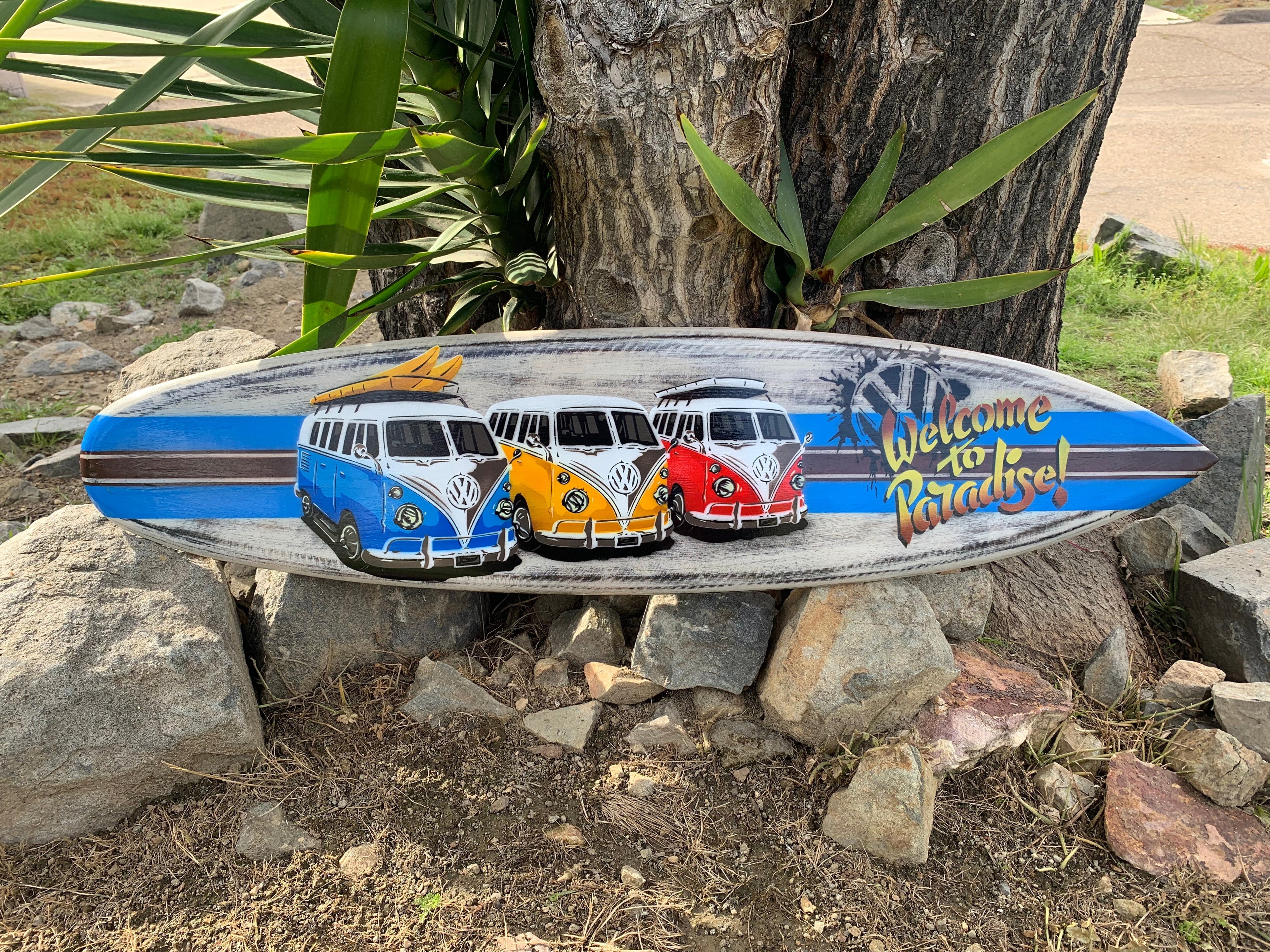 "Welcome to Paradise" Volkswagen VW Busses Airbrushed Surfboard Wall Plaque Mango Wood 39"x 10"