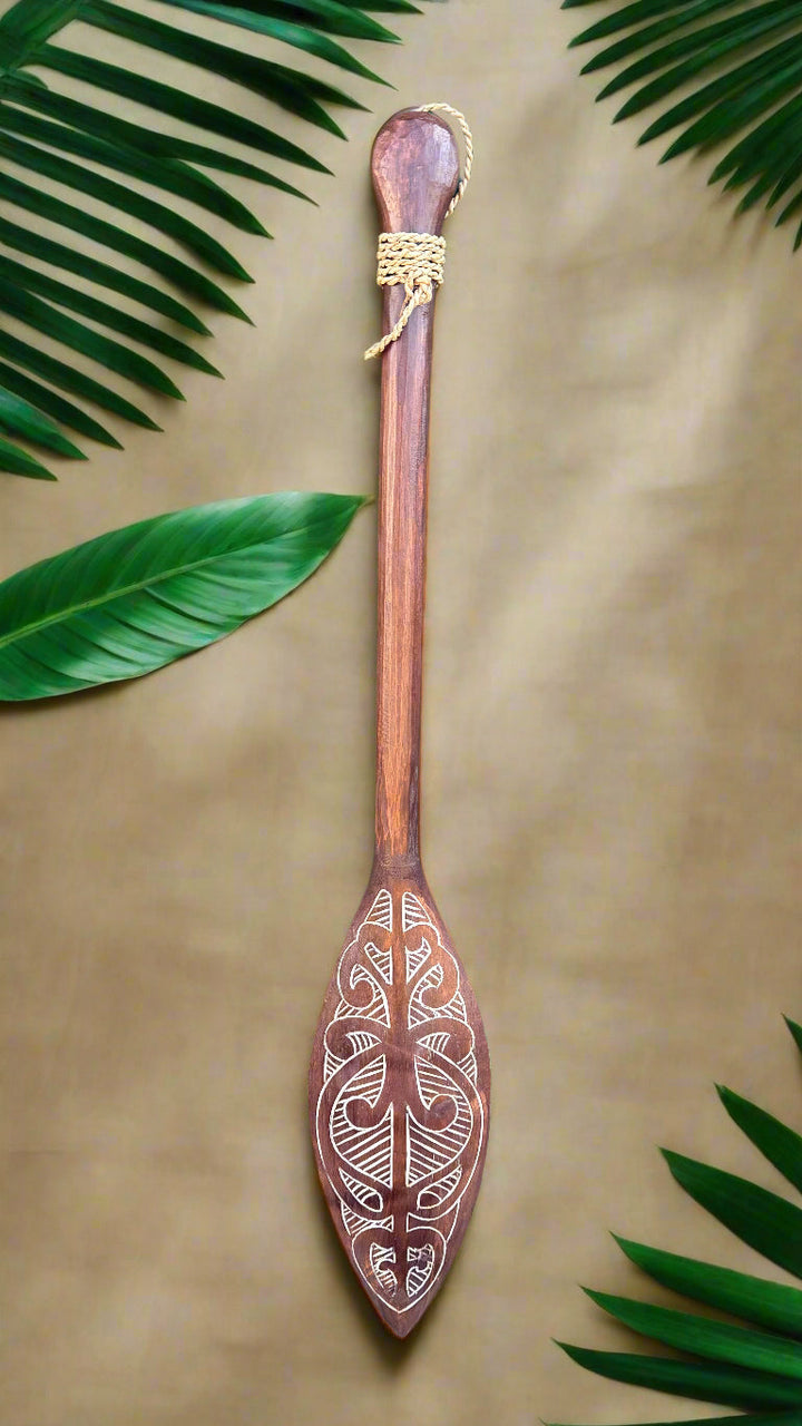 The Decorative Tribal Tiki Paddle/Oar is a nautical decor piece featuring a tribal pattern. Measuring 39 inches in length and 6 inches in width, this wooden paddle/oar is designed to add a touch of tropical charm to any room, particularly suited for a Tiki bar or themed space. The carved tribal design enhances the overall Tiki style of the piece, making it a unique and eye-catching addition to your home decor.