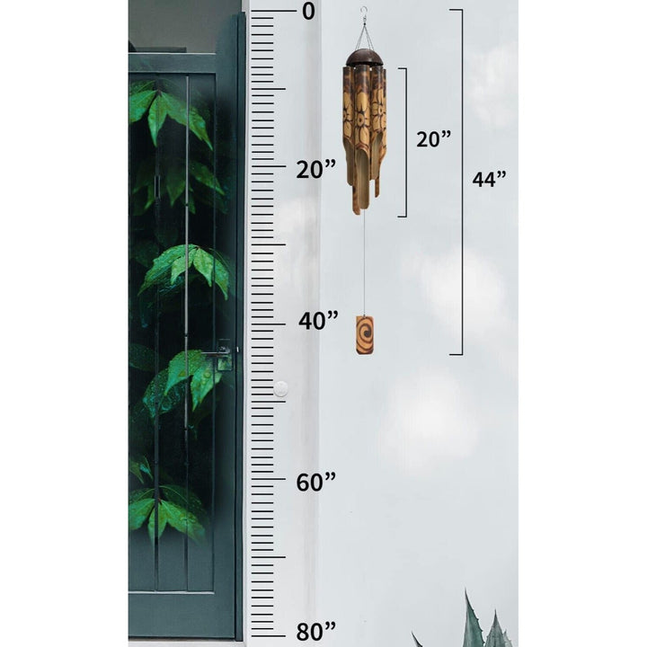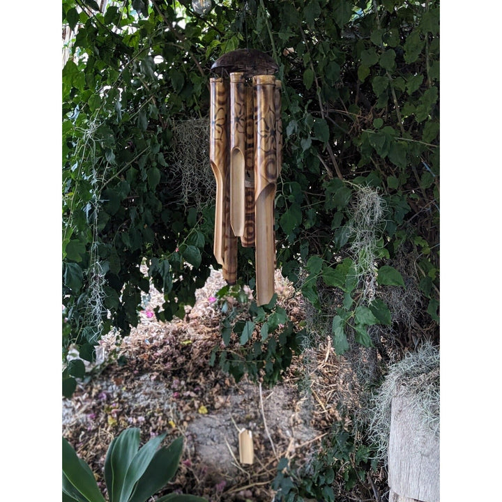 Just arrived these new bamboo wind chimes. The design is a hand burned hibiscus flower design. The artist makes the the top from a half of coconut shell. Each bamboo is cut at the nodes to produce the tropical sounds. These will make a nice addtion to any tropical or tiki themed room. A nice wind chime at a nice price. These measure approximately from top of coconut to bottom of the windchime is 24" and the coconut will measure 6-7".