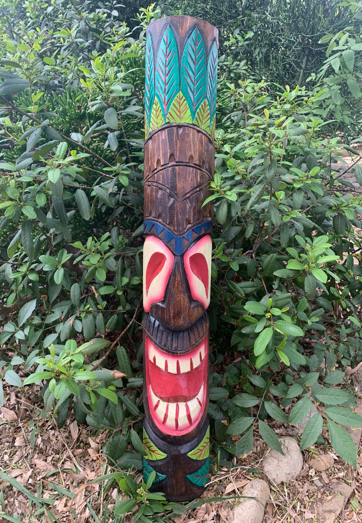 This hand-carved wooden tiki mask would make a great addition to your home, patio, yard, or tiki bar! These masks are beautifully hand crafted and painted making each one unique. The backs of the masks are hallowed out to fit around poles, or can be hung flat up on the wall. This mask will make a great gift, or buy it for yourself! :) 39"x 6" inches