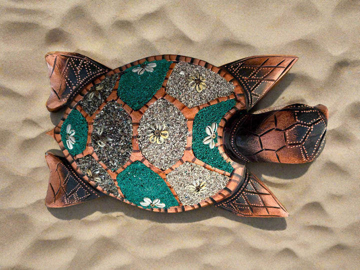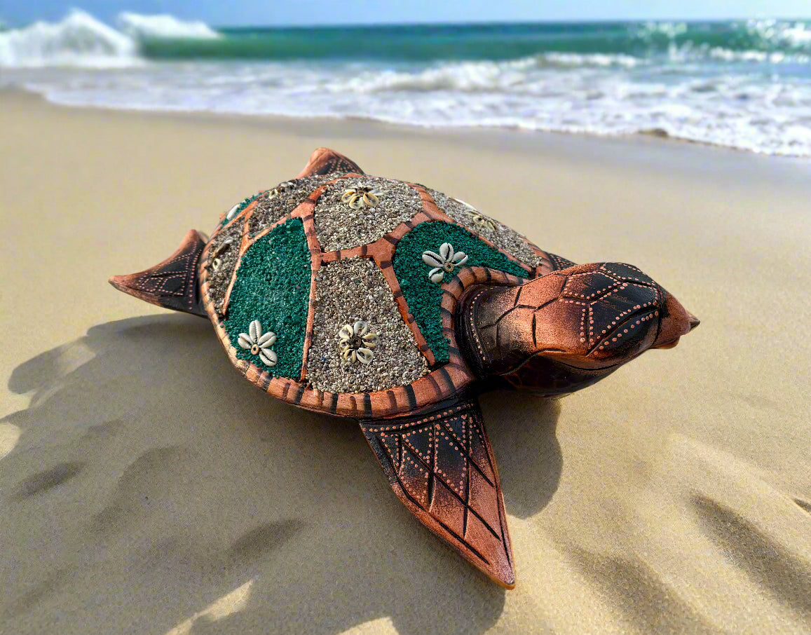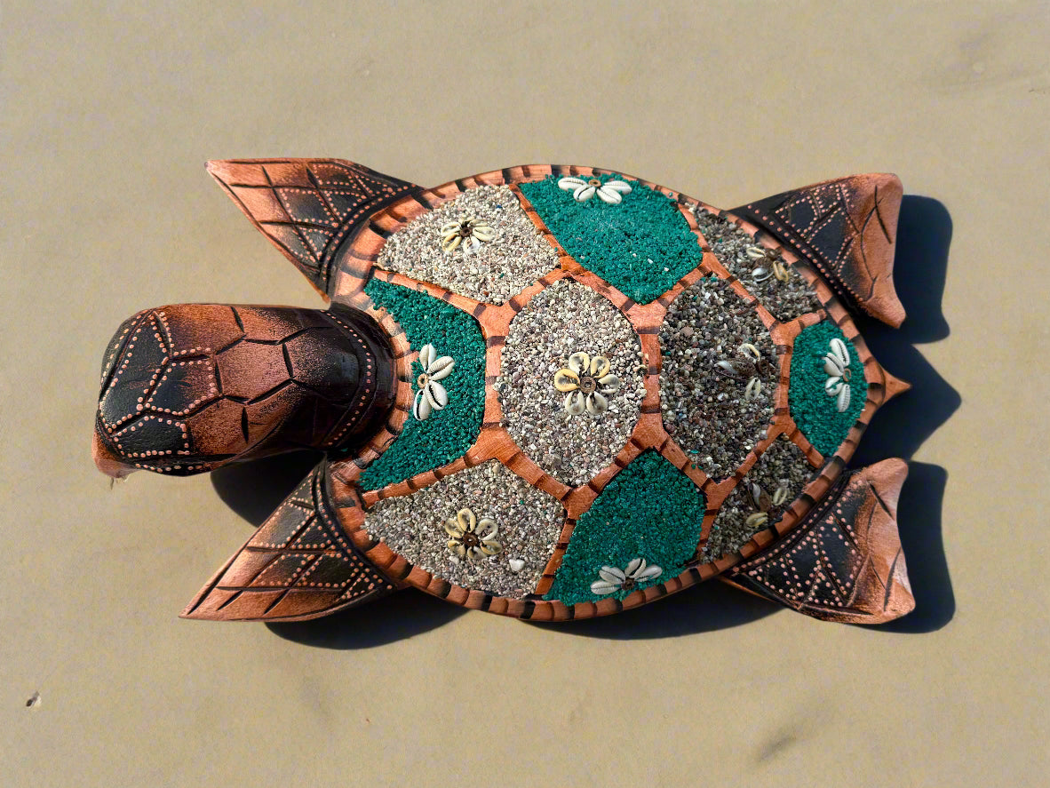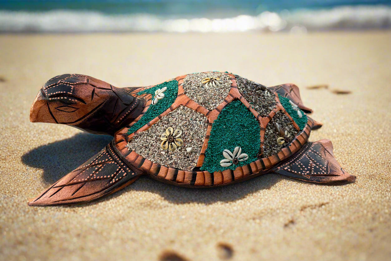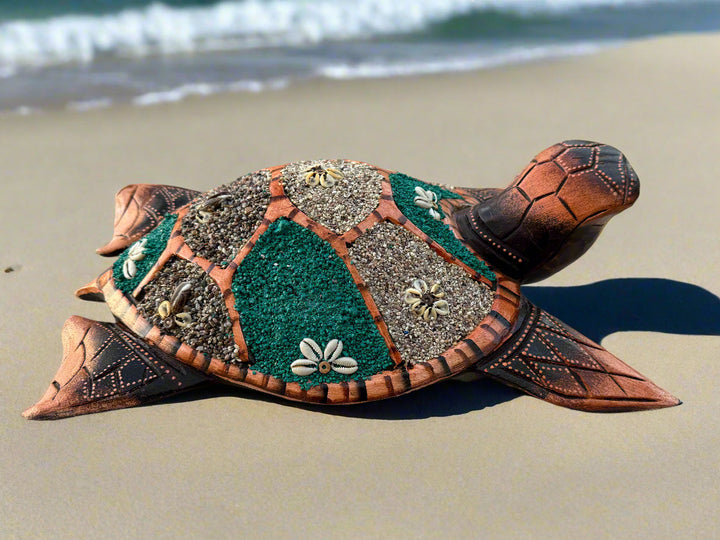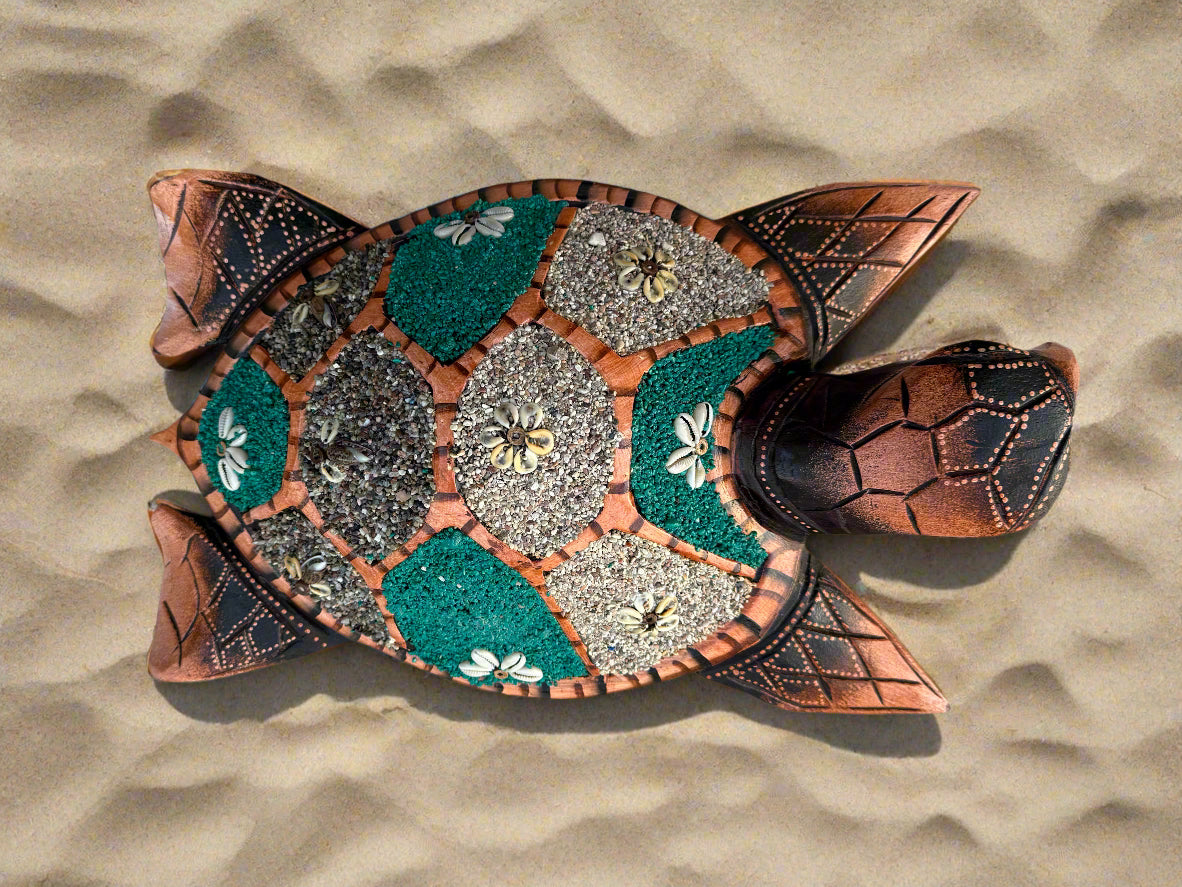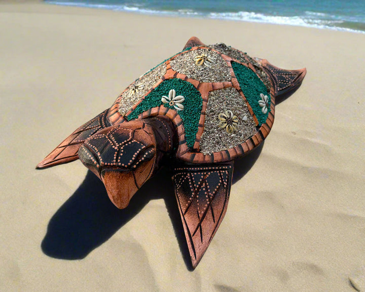 Hand Carved Wood Turtle Sand Seashells Nautical Tropical Island Sculpture 16"x 10"