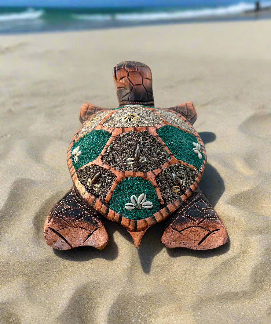 If you love the beach you will adore this hand carved turtle statue. Each one is decorated beautifully with beach gravel, colored rocks and stones, and detailed with real seashells. Embrace your beach front paradise! These make wonderful gifts for family and friends, for any occasion. Measures approximately 16 inches long, 10 inches wide, and 4 inches in height.