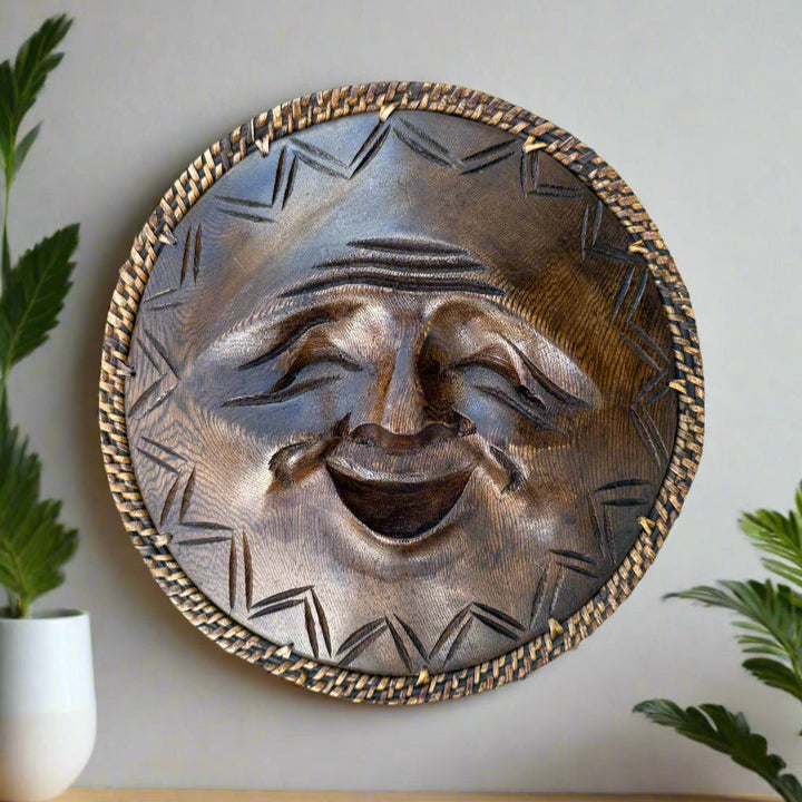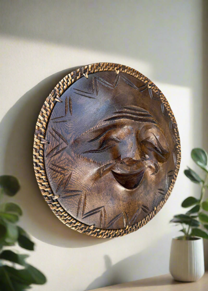 Happy Moon Wall Decor Hand Carved Monkey Pod 12 inches