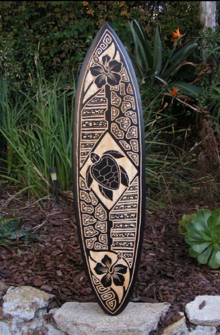 This beautiful hand crafted surfboard wall plaque is one of a kind! It has a Sea Turtle and Hibiscus Flowers with a tribal design. It would make a great addition to your home, patio, or tiki bar. It is hand carved with intricate detail from top-of-the-line mango wood. It is flat back to hang on the wall. This surfboard would make an awesome gift. or keep it for yourself! 39x 10 inches.