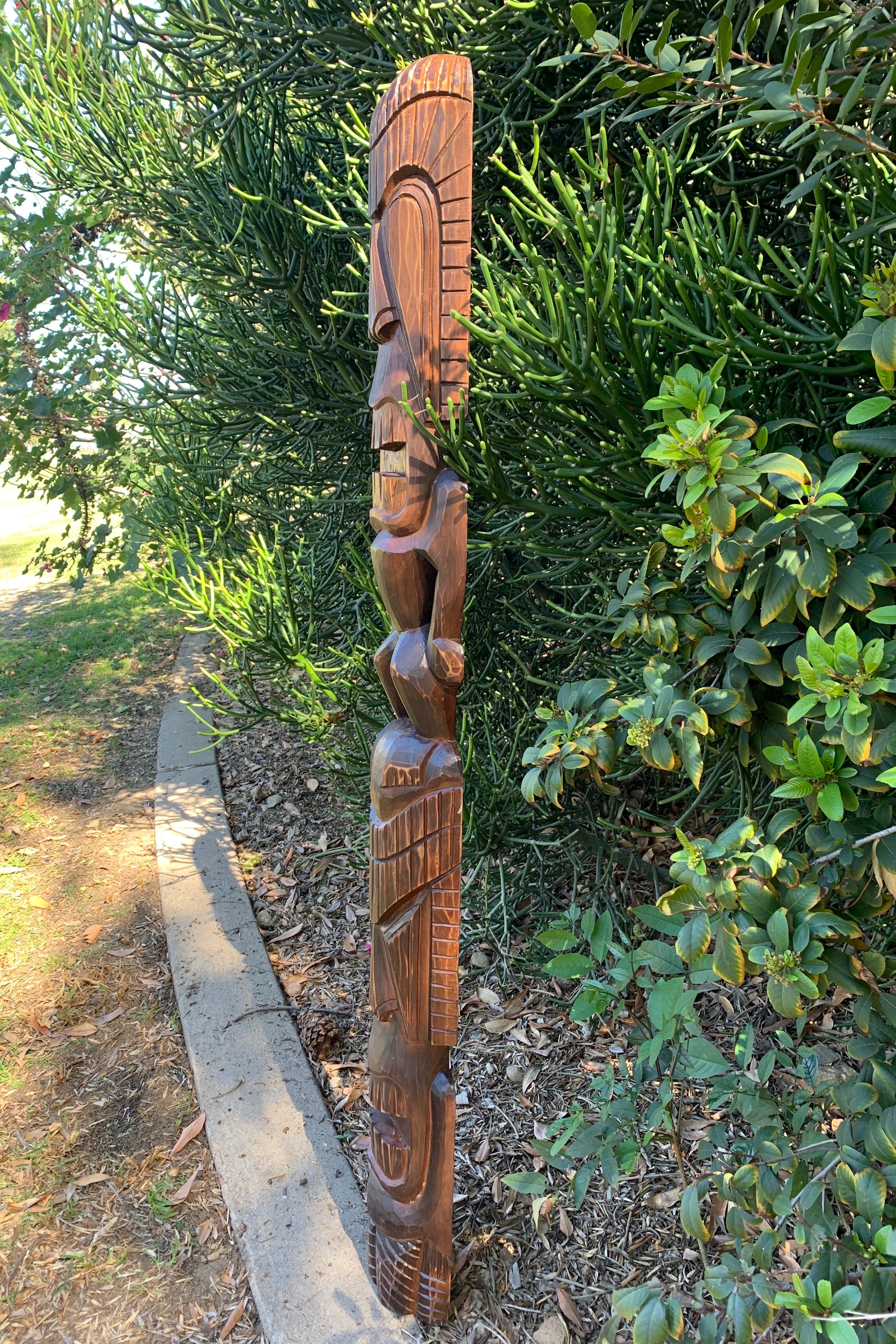 Beautiful hand carved Ku and Kane Hawaiian style wood tiki totem statue. Ku is the Hawaiian God of war and Kane is the god of love and prosperity. This carving can be hung on the wall, or as a statue. Great for indoors or outdoors. These measure approximately 5ft"x 6-7in". Makes a great gift! Or put this piece up in your own home, yard, patio, or tiki bar!