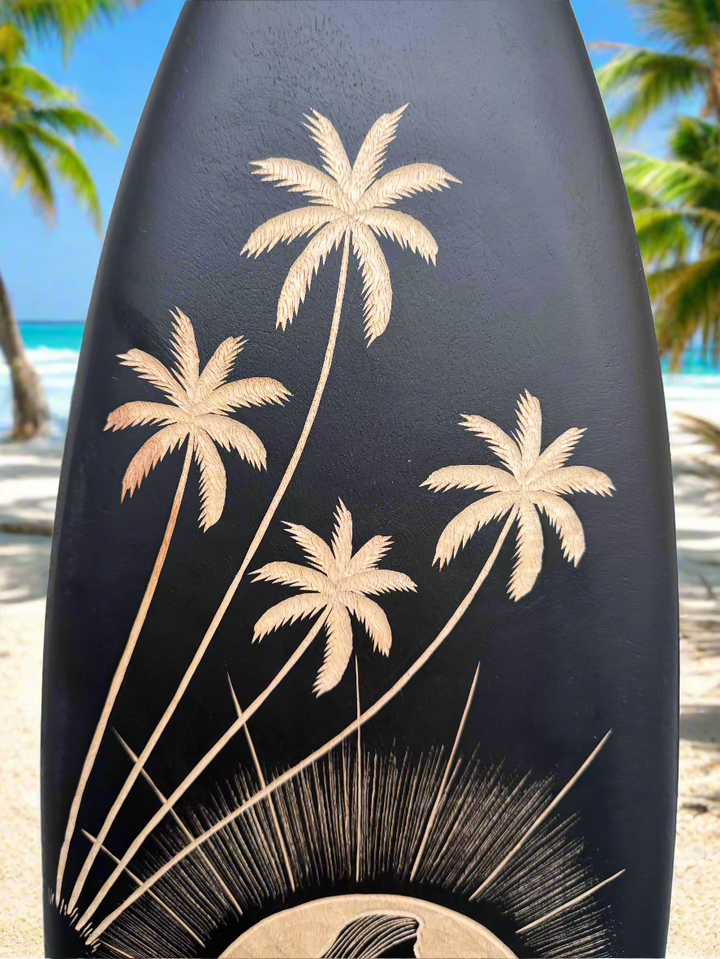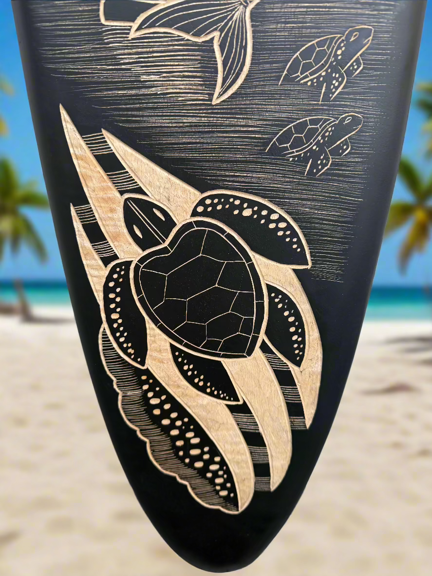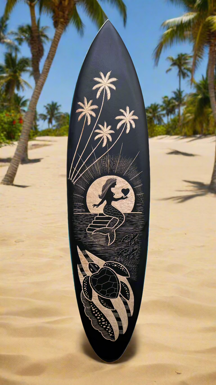 Enhance your living space with the Mermaid and Sea Turtle Moon Light Surfboard Wall Plaque, a stunning piece that embodies the essence of beach and tropical themes. Crafted from high-quality mango wood, this medium-sized, wall-mounted decor measures 39 inches in height and 10 inches in width, making it a perfect fit for any room seeking a touch of nautical charm.  Handmade with attention to detail, this surfboard-shaped plaque features intricate designs that include a serene mermaid and a charming turtle, adding a whimsical yet sophisticated aesthetic to your decor. No additional parts are required for this exquisite piece, which is meticulously carved with detail, ensuring a unique and authentic addition to your home.