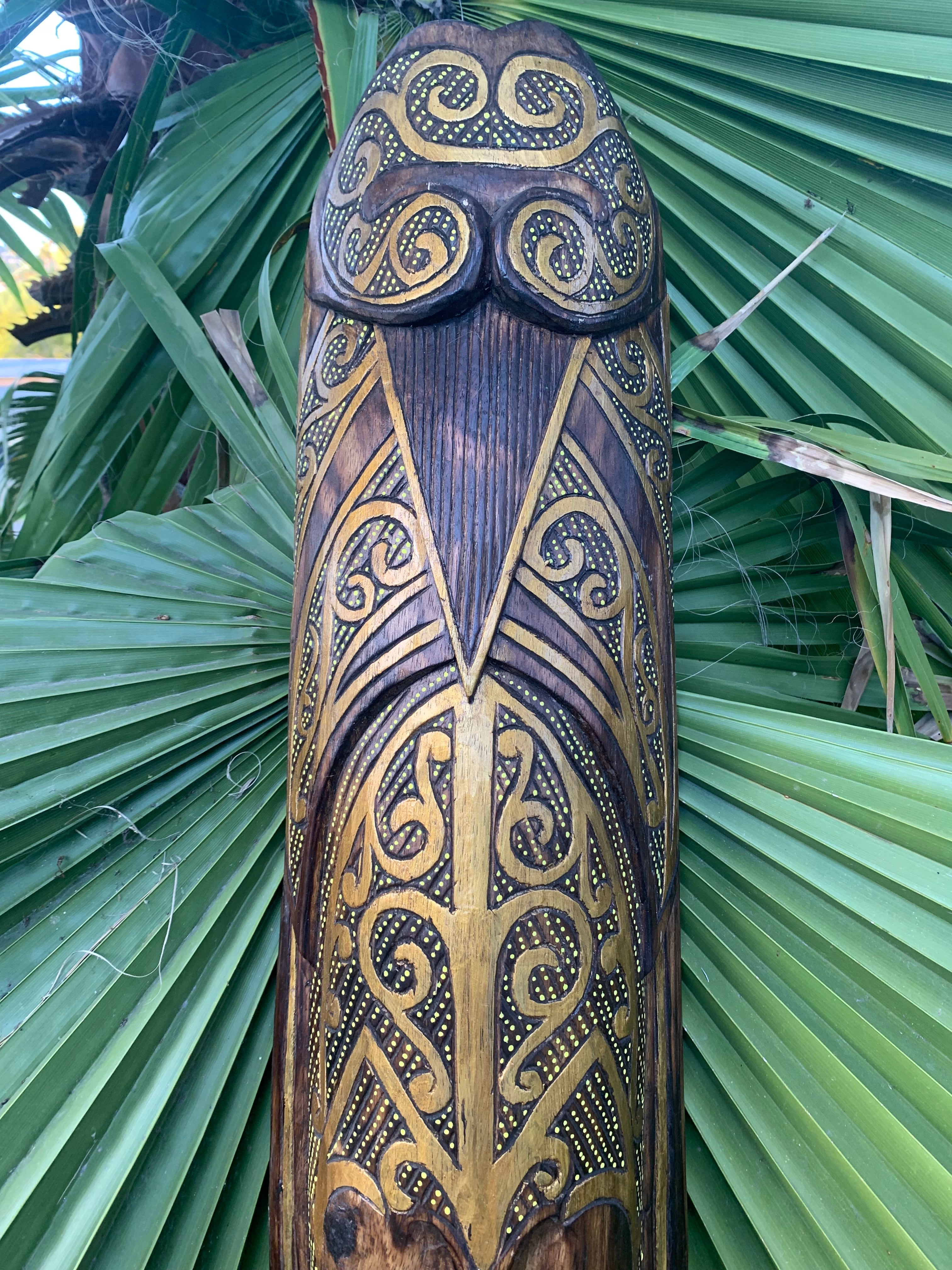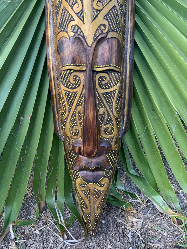 This Primitive Tribal Tiki Mask is a great way to bring some excitement to your home decor. The Maori inspired mask is hand carved and painted with immaculate detail. Would make a great gift, or bring a piece of the islands to your home, patio, or tiki bar! Measures 39”x 8” inches