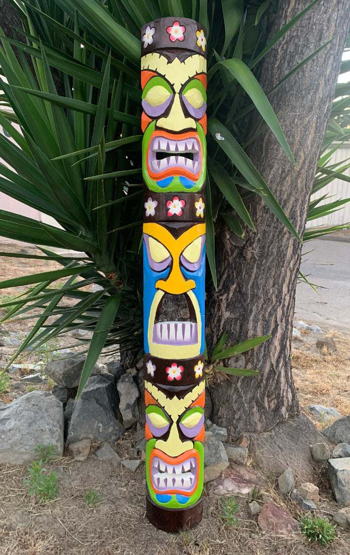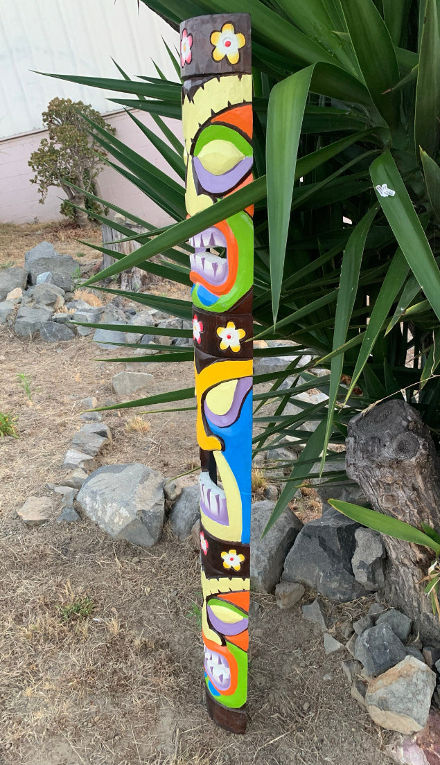 This colorful set of hand-carved wooden tiki masks would make a great addition to your home, patio, yard, or tiki bar! These masks are beautifully hand crafted and painted making each one unique. The backs of the masks are hallowed out to fit around poles, or can be hung flat up on the wall. This mask will make a great gift, or buy it for yourself! :) 60"x 7" inches Will eventually start to fade if left out in the sun. We highly recommend an polyurethane gloss spray with UV protection for upkeep.