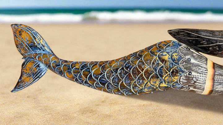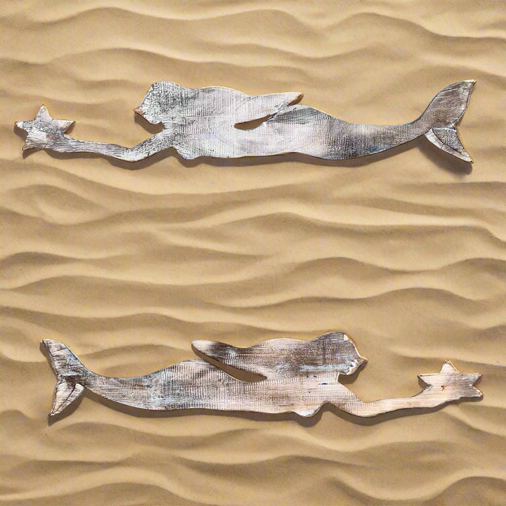 This "Set of Mermaid Wood Carvings" are hand carved and painted sculptures measuring 39 inches in length and 7 inches in height each. Handmade from wood, this nautical-themed decoration features a mermaid, perfect for adding a touch of coastal charm to a Tiki bar or any space with a maritime aesthetic. The intricate carving technique highlights the craftsmanship involved in creating this unique and artistic piece of decor.