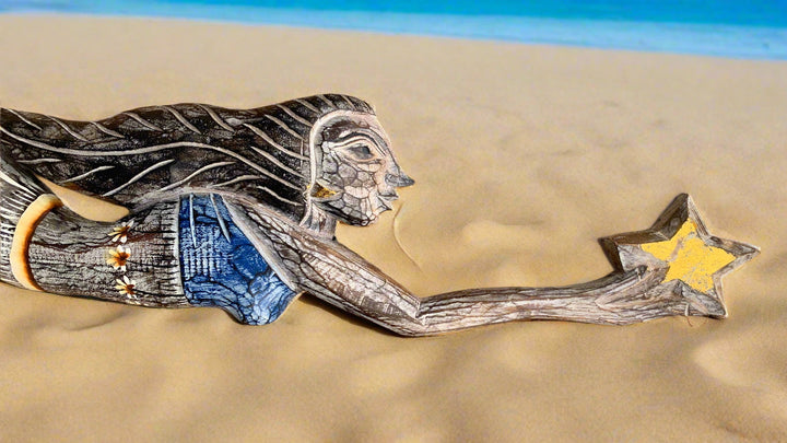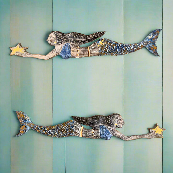 Set of Blue Mermaid Wood Carvings Nautical Tiki Bar Decor 39x 6 inches