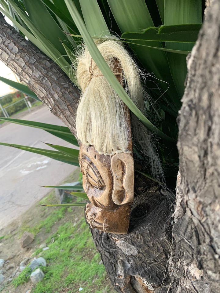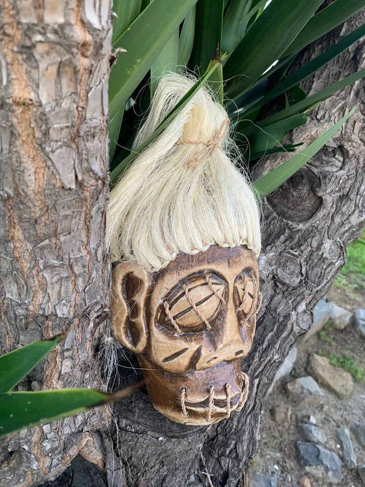 We are excited about our new Shrunken Heads we helped design! Hand carved from albesia wood and painted. The hair is made from natural fibers. Let everyone know you have the coolest tiki bar in town a a Shrunken Head wall plaque. This carving is flat on the back with a hanger to be hung on the wall. Would make a great addition to your home or tiki bar! These measure approximately 12"x 6.5".