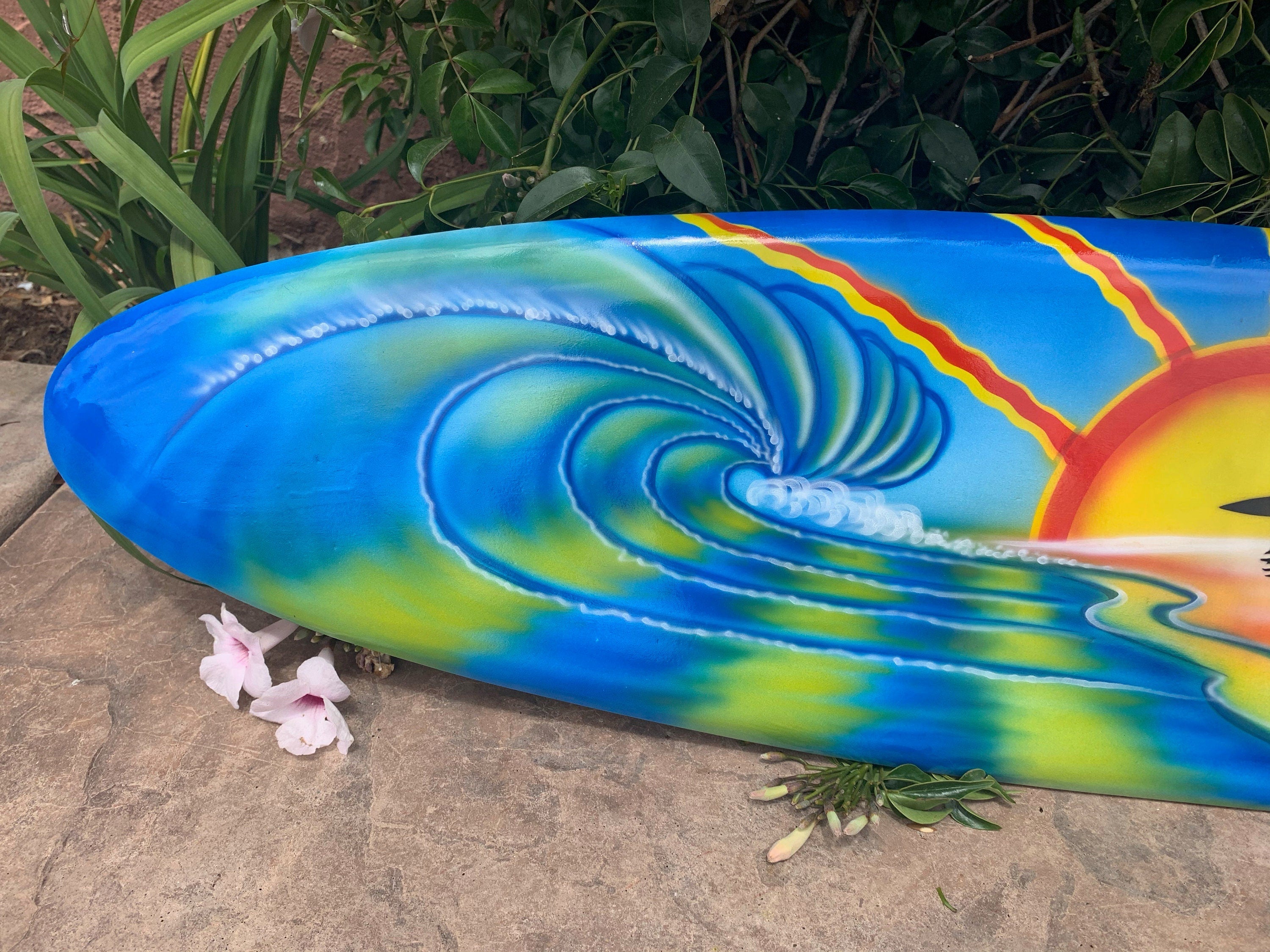 This beautiful hand crafted surfboard plaque is perfect for anyone who likes to catch the morning surf. The air brush paint job is truly stunning. It would make a great addition to your home, patio, yard, or tiki bar. It is hand carved from top-of-the-line mango wood, and has a flat back to hang on the wall. This surfboard would also make an awesome gift! 39x 10 inches