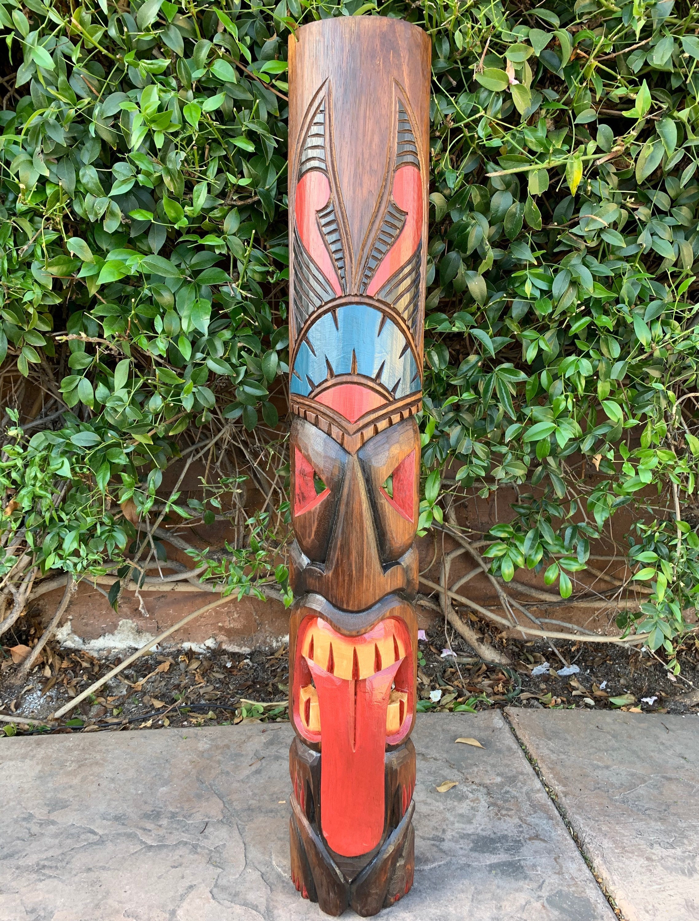This hand-carved wooden tiki mask would make a great addition to your home, patio, yard, or tiki bar! These masks are beautifully hand crafted and painted making each one unique. The backs of the masks are hallowed out to fit around poles, or can be hung flat up on the wall. This mask will make a great gift, or buy it for yourself! :) 39"x 6" inches
