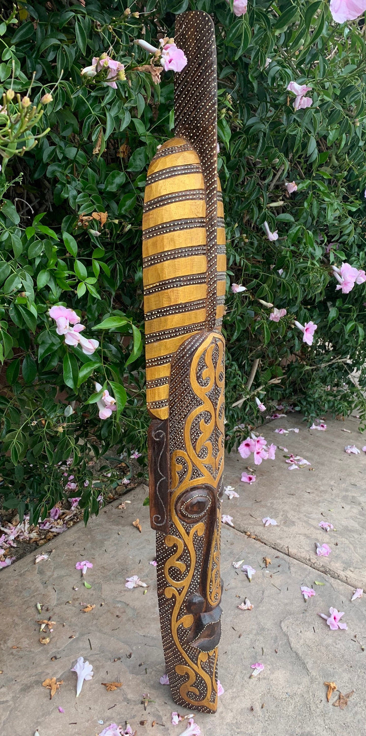 This Primitive Tribal Mask is a great way to bring some excitement to your home decor. The mask is hand carved and painted. Would make a great gift, or bring a piece of the islands to your home, patio, or tiki bar! Measures 39”x 6” inches