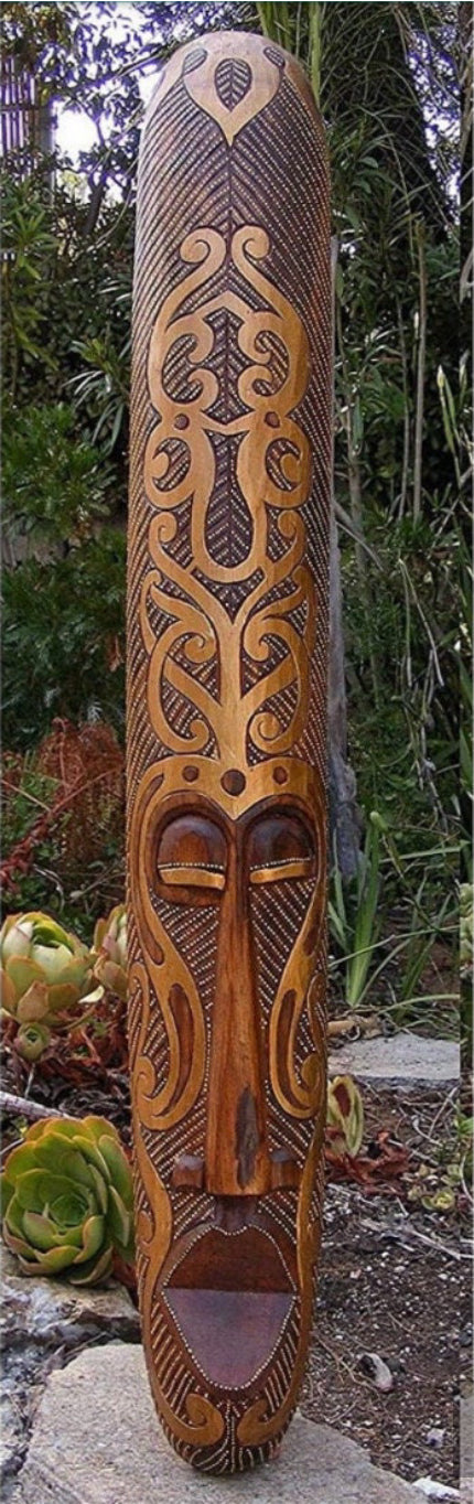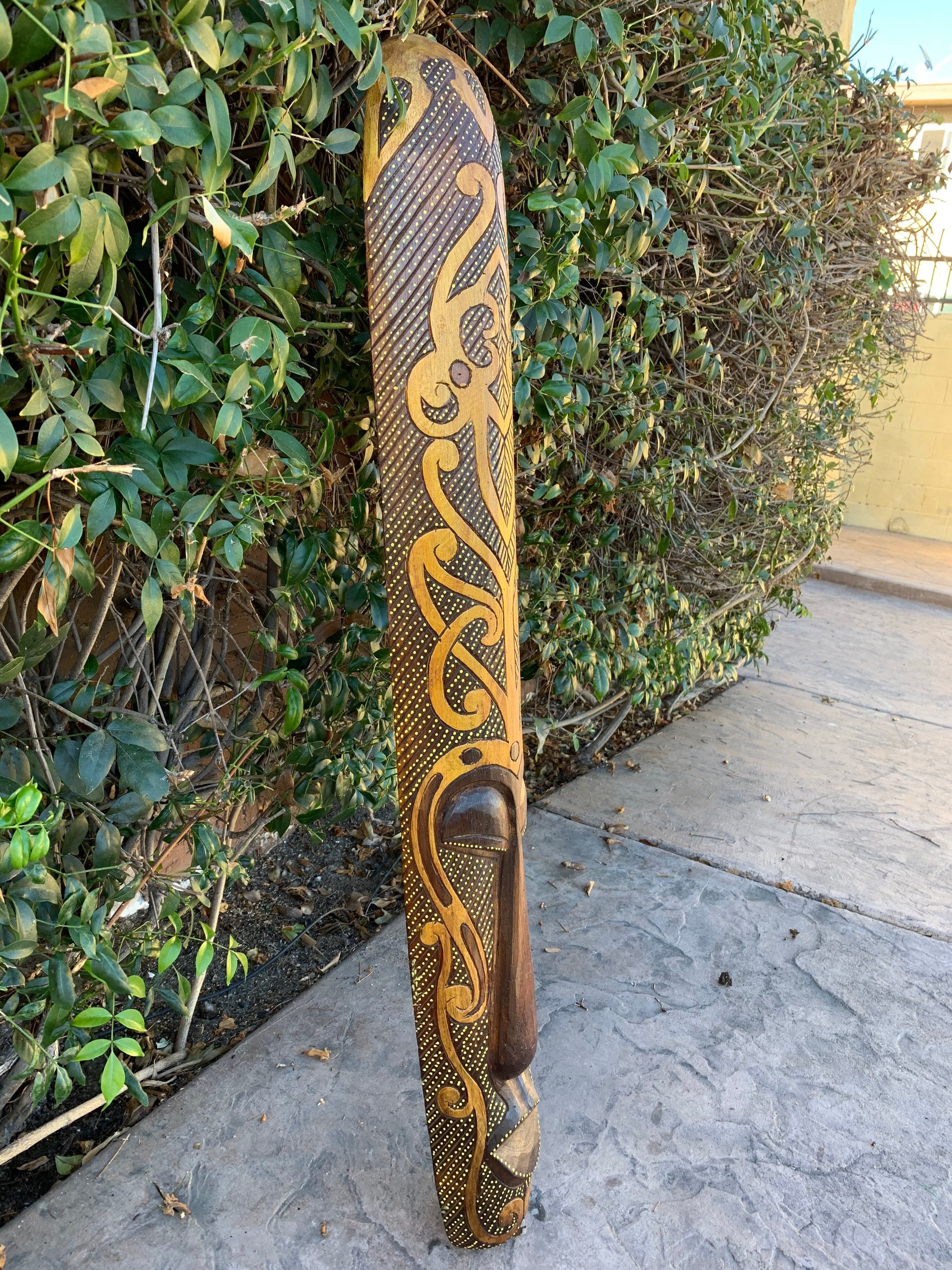 This Primitive Tribal Mask is a great way to bring some excitement to your home decor. The mask is hand carved and painted using the aboriginal dot art technique. Would make a great gift, or bring a piece of the islands to your home, patio, or tiki bar! Measures 39”x 6” inches