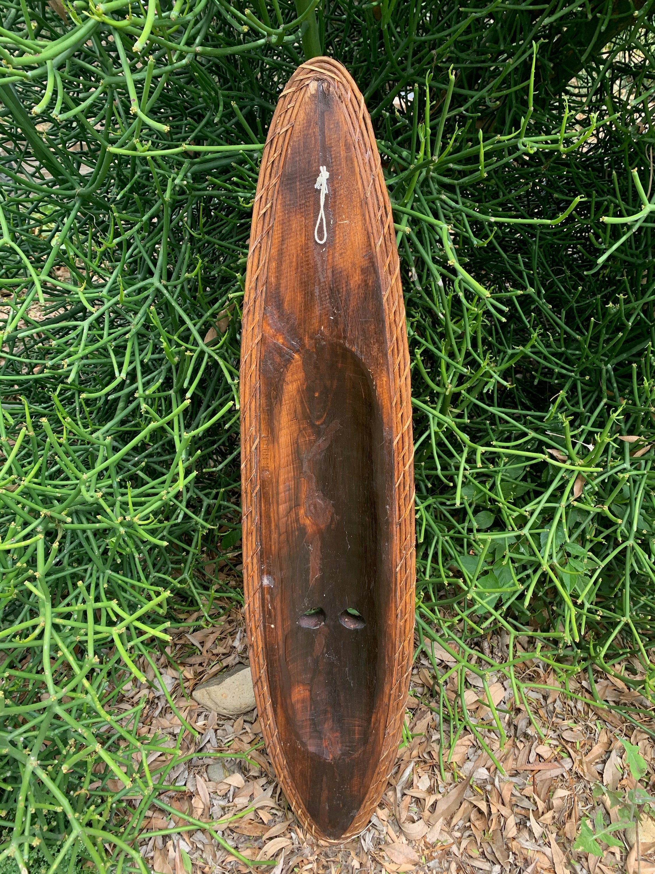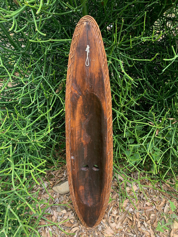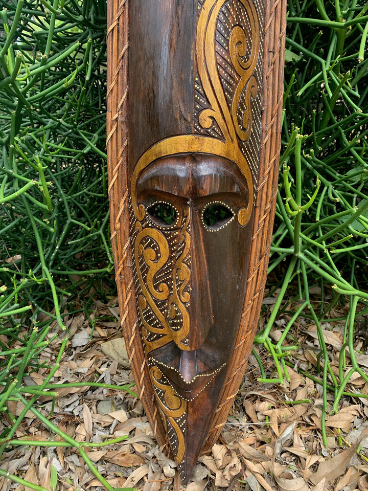 Spice up your home decor with this awesome primitive tribal mask. Hand carved from albesia wood and hand painted. There is a hanger on the back to hang on the wall. Measures 39”x 7” inches.