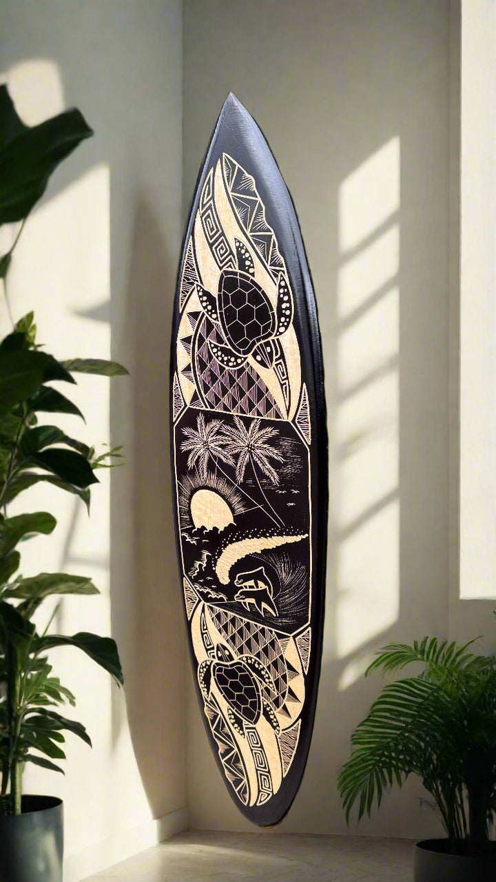 This beautiful hand crafted surfboard plaque is perfect for surfboard and turtle lovers alike. It features dolphins catching waves, with tribal turtles on both sides. It would make a great addition to your home, patio, or tiki bar. It is hand carved from top-of-the-line mango wood, and has a flat back to hang on the wall. This surfboard would make an awesome gift! 39x 10 inches