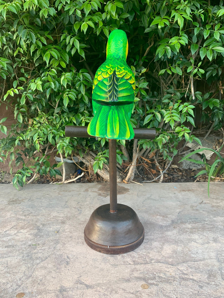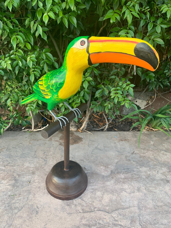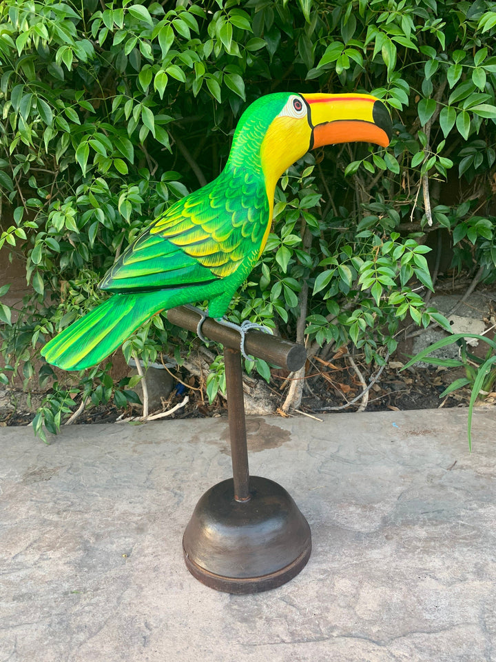 This beautiful hand carved and painted tropical toucan would make a great addition to any room in your house! It also would make a great addition to your balcony, patio, yard, or tiki bar. It's a fun way to brighten up any space. The bird itself measures 20"inches from head to tail, and sits upon a wood carved perch. The perch is 11 inches tall and 9 inches wide. This colorful bird would make an amazing gift for any tropical bird lover, or bring it home to your jungle!