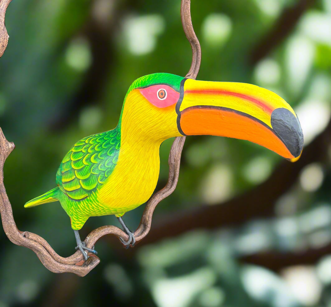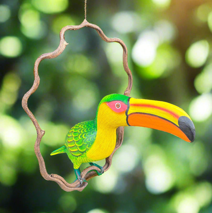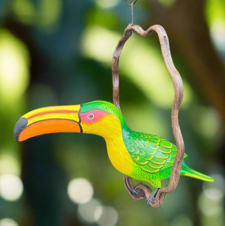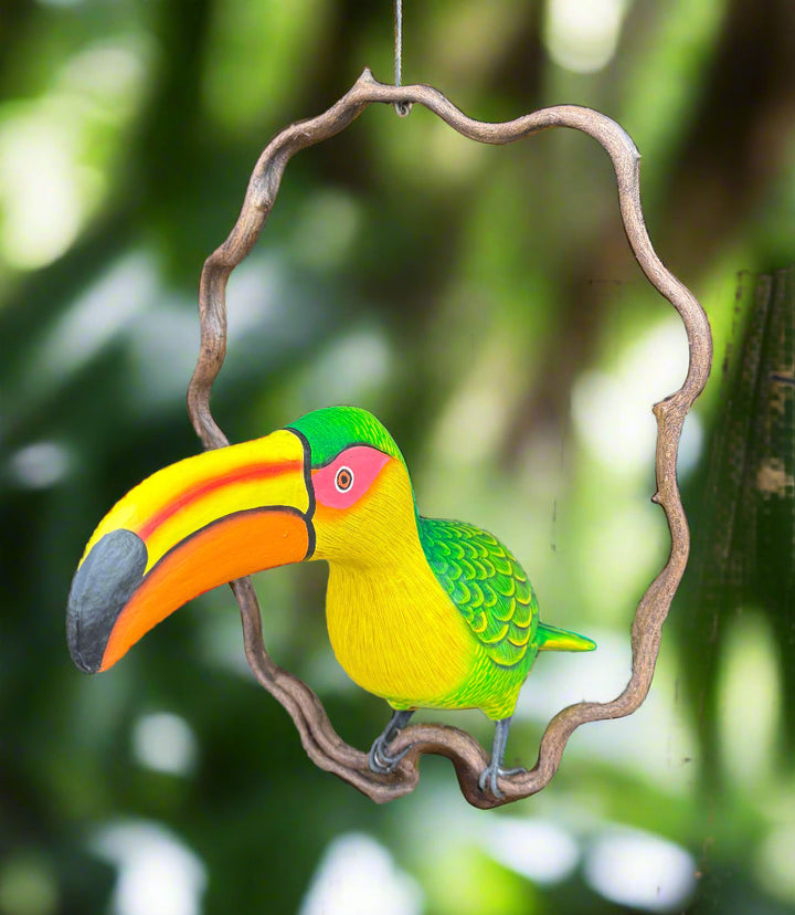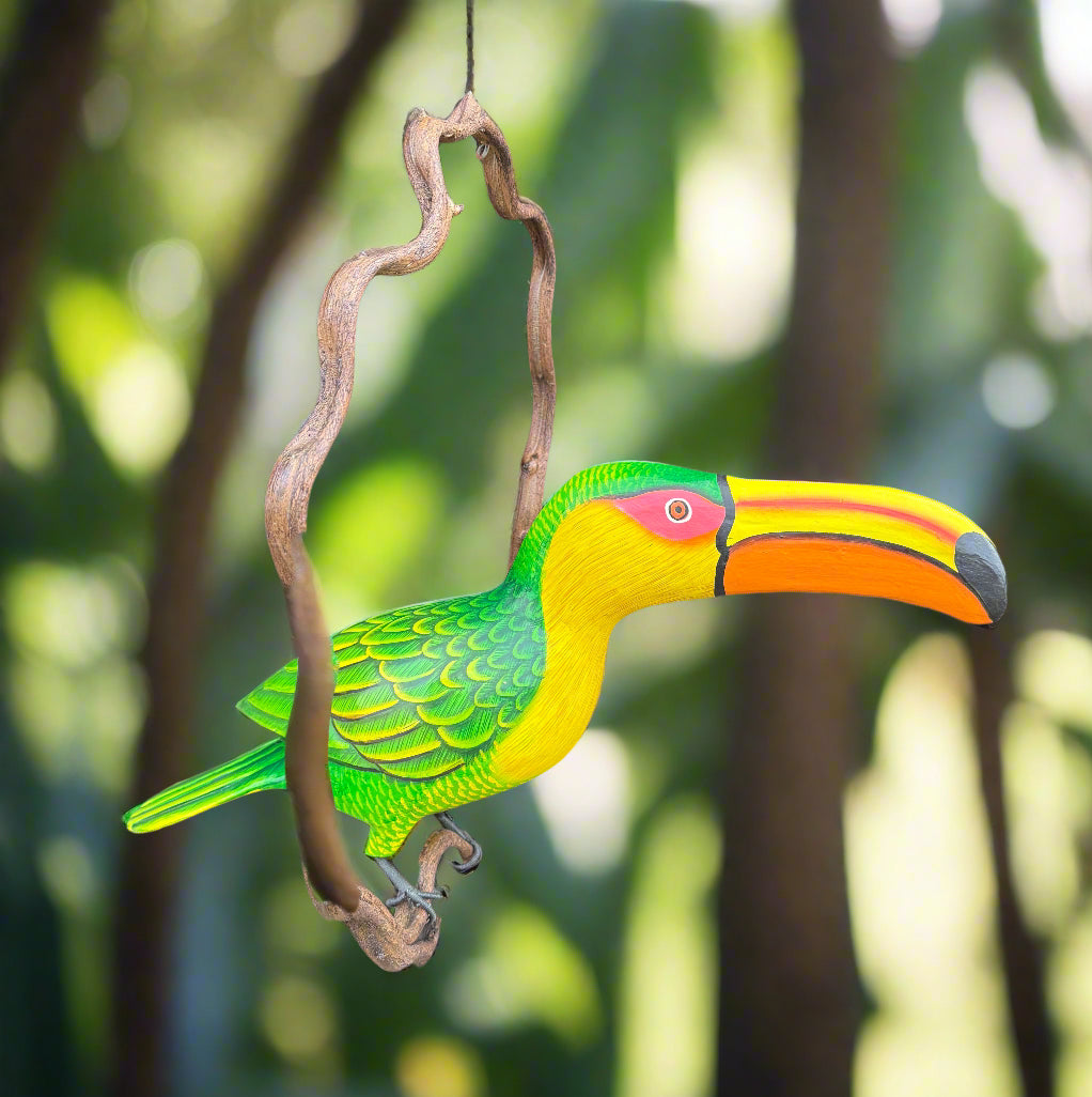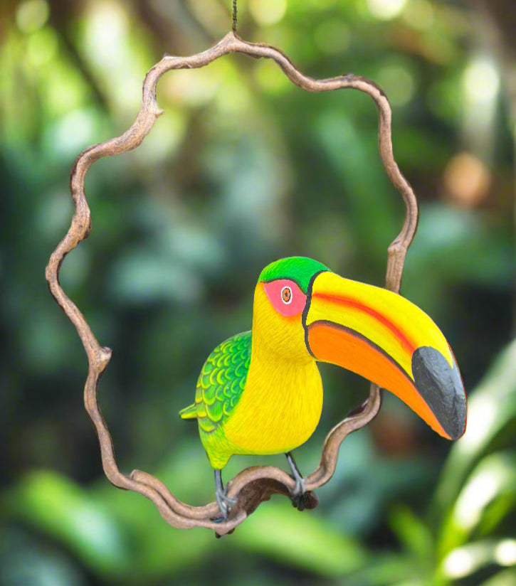 Beautiful Wood-carved Toucan. Each one is hand carved and painted, creating a one of a kind piece of art. The tropical bird sits upon a unique wooden perch that frames the carving like a vine. This would make a wonderful gift for any tropical bird lover. Or a beautiful addition to your home, patio, yard, or Tiki bar!!! 12"x12" with perch frame. The bird itself is 20” from head to tail.