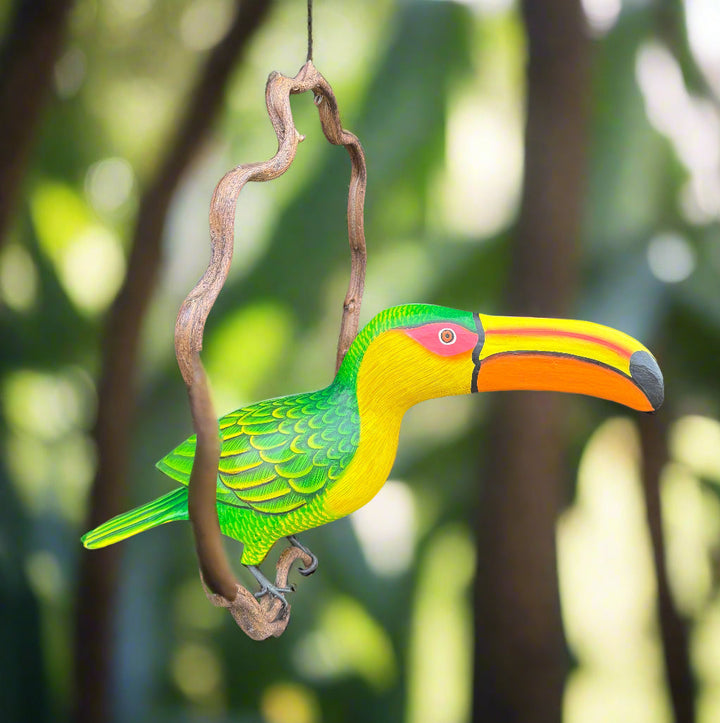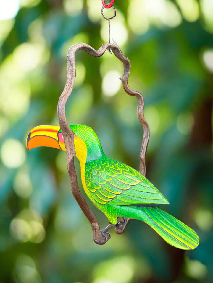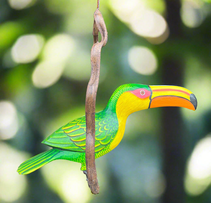 Tropical Green Toucan Wood Carved Hanging Bird Statue 20”