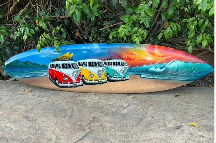 This beautiful hand crafted surfboard wall plaque is perfect for surfboard and VW lovers alike. The paint job is truly stunning. It would make a great addition to your home, patio, or tiki bar. They are hand carved from top-of-the-line mango wood, and have a flat back to hang on the wall. These surfboards would also make an awesome gift! The 3 Surfboards are 39x 10 inches each