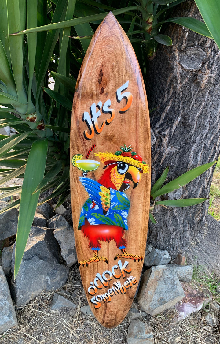 This colorful hand carved and painted surfboard sign would look great in your home, patio, or tiki bar! Beautifully airbrushed on top of the line mango wood with a parrot drinking a cocktail. You can see the beautiful grains of the wood in the background. This “It’s 5’ o clock somewhere" sign is sure to grab attention. Let the festivities begin once this sign goes up. 39"x10”